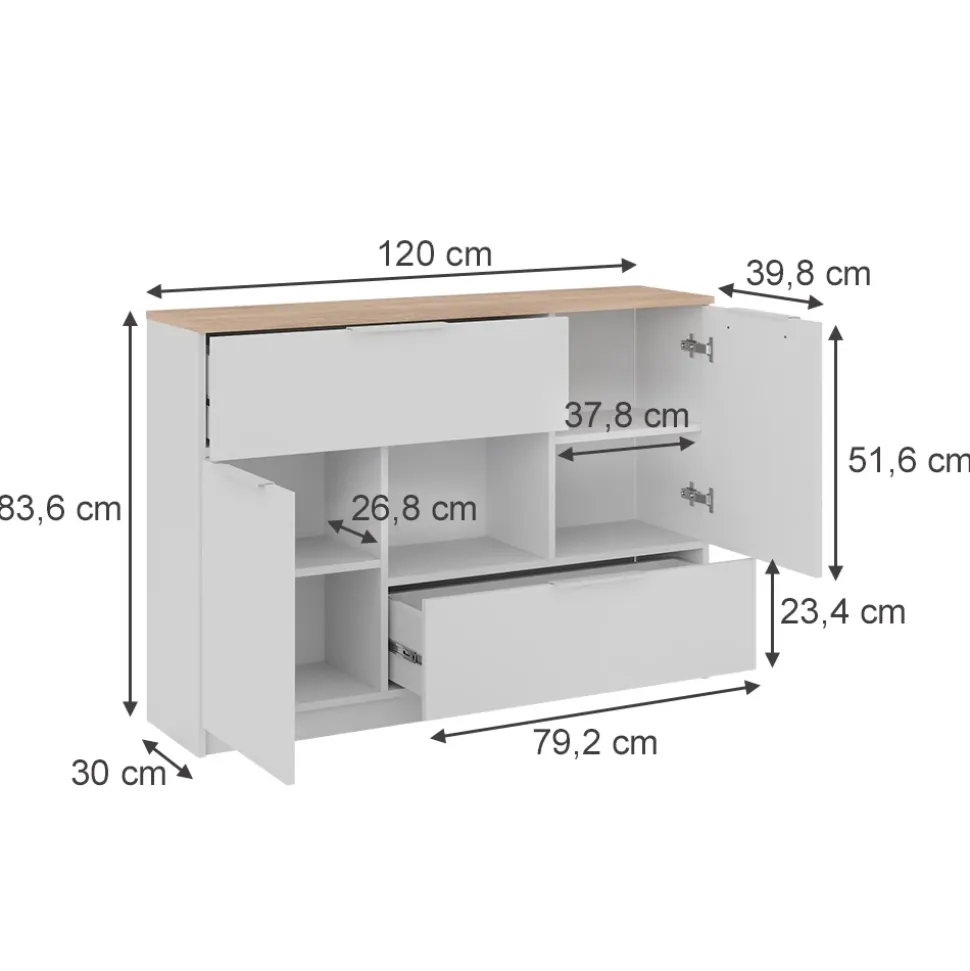 - MAßE: Die Kommode mit Schubladen hat eine Breite von 120 cm, eine Höhe von 83.6 cm und eine Tiefe von 30 cm. Alle detaillierten Größen sind auf den Fotos angegeben.