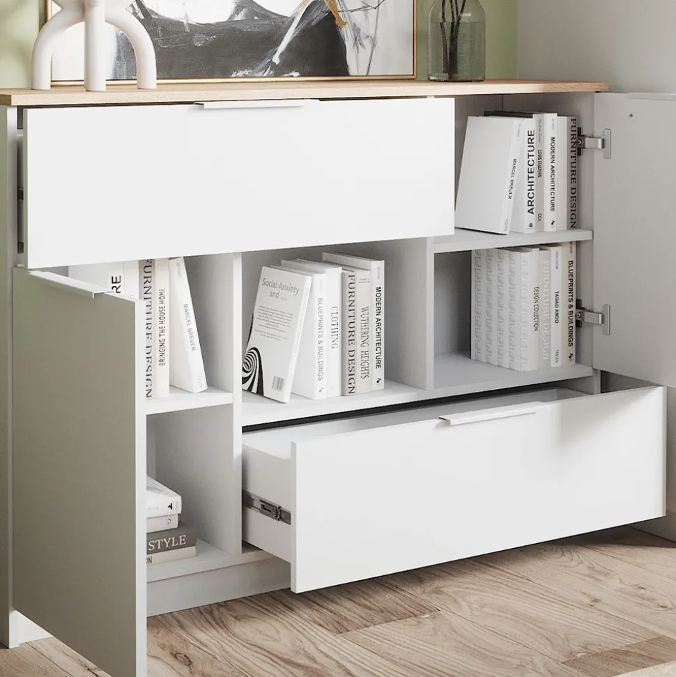Das Betti Sideboard ist das perfekte Möbelstück für alle, die eine moderne und stilvolle Atmosphäre in ihrem Zuhause schaffen wollen. Mit seinen 2 Türen und 2 Schubladen bietet es nicht nur viel Stauraum, sondern ist auch äußerst vielseitig einsetzbar. Das Sideboard Betti ist die perfekte Ergänzung für das Wohn- oder Schlafzimmer. Die Schubladen sind besonders praktisch, um Dinge zu verstauen, die man schnell zur Hand haben möchte. Das Betti-Sideboard ist Teil der gleichnamigen Serie und bietet somit zusätzliche Möglichkeiten zur Gestaltung Ihres Wohnzimmers. Mit diesem Möbelstück bringen Sie einen einzigartigen Stil in Ihr Zuhause und schaffen eine Atmosphäre, in der sich jeder wohlfühlen wird.
