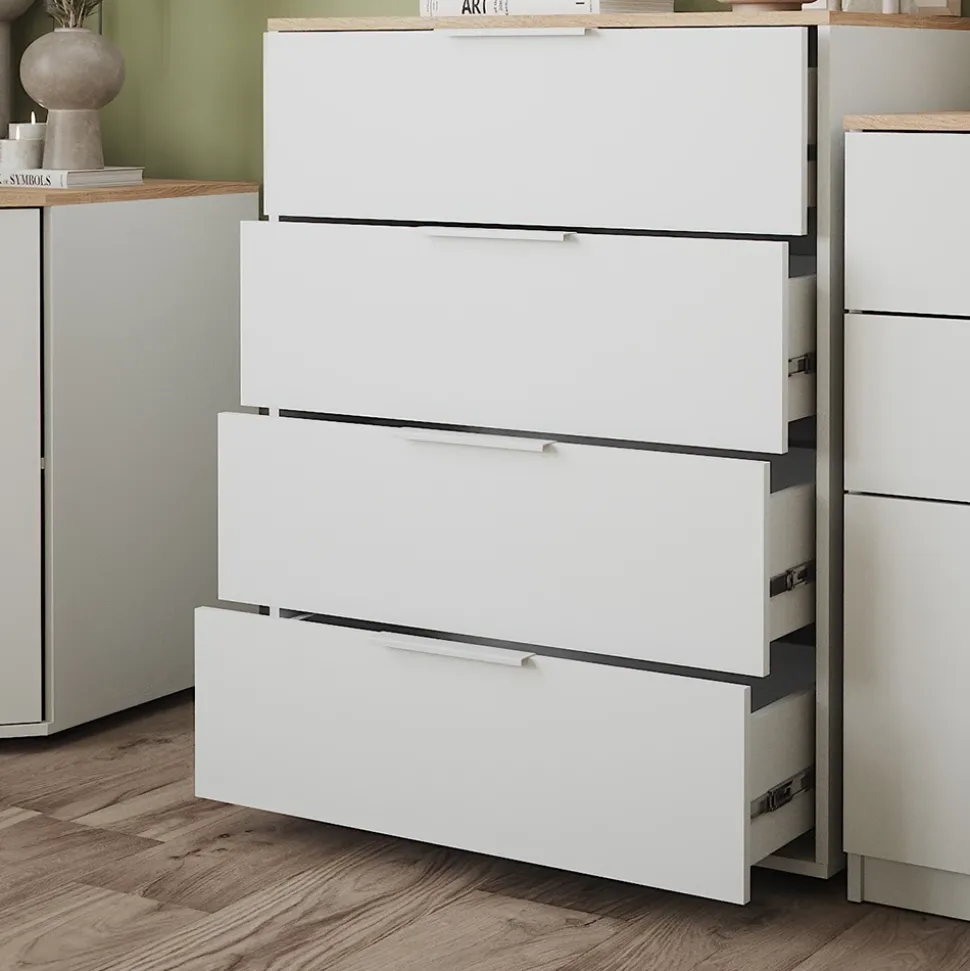 - Der Kommodenschrank bietet viel Stauraum bei modernem und zeitlosem Design. Er verfügt über 4 Schubladen.