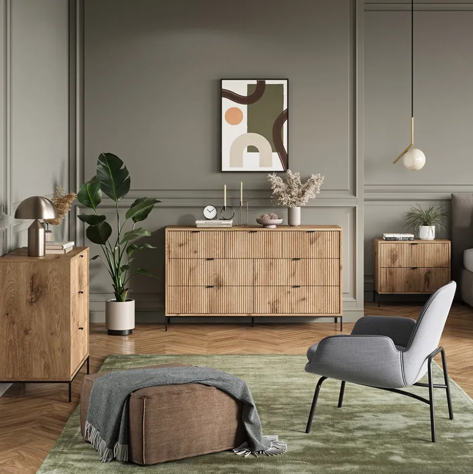 Die Kommode Eliza ist nicht nur ein einfacher Schubladenschrank, sondern ein echtes Multitalent. Mit ihrem modernen Design fügt sie sich nahtlos in jedes Wohnambiente ein und bietet dabei viel Stauraum für all Ihre Habseligkeiten. Dank der funktionalen Aufteilung eignet sich die Kommode perfekt als Sideboard oder Anrichte. Zudem ist sie platzsparend und lässt sich wunderbar mit anderen Artikeln der Eliza Serie kombinieren. Geben Sie Ihrem Schlafzimmer mit der Kommode Eliza ein stilvolles Upgrade und erleben Sie, wie praktisch und schön Ordnung sein kann.