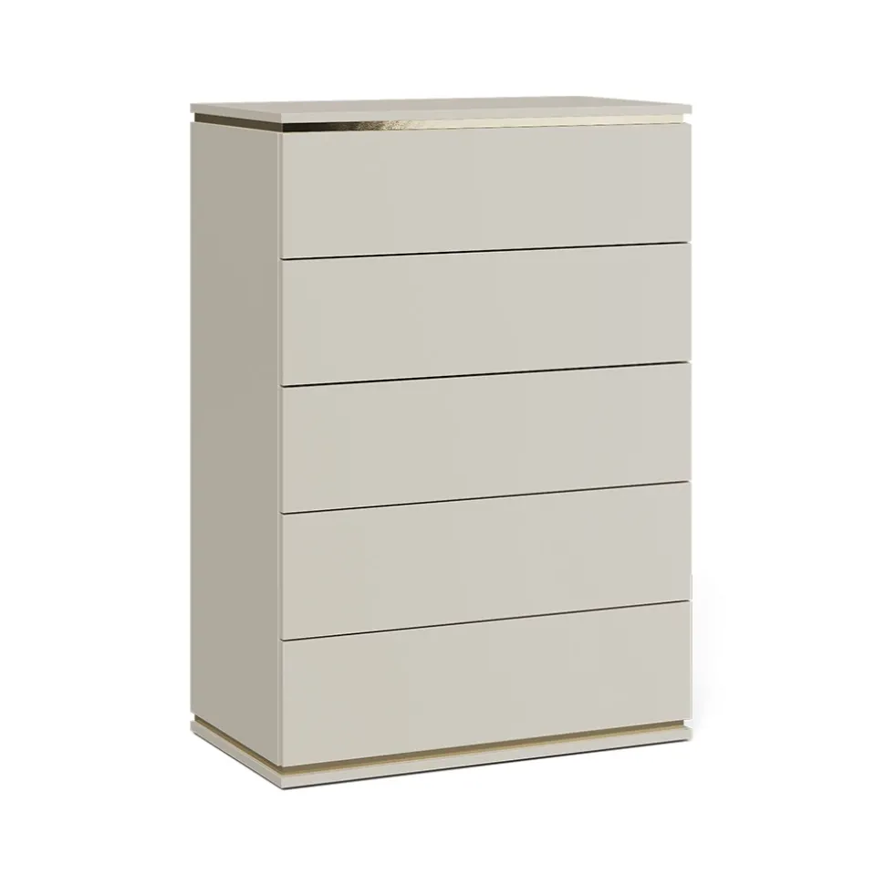 Die Kommode Linette ist nicht nur ein praktisches Möbelstück, sondern auch ein echter Blickfang für Ihr Schlafzimmer. Mit fünf geräumigen Schubladen bietet sie ausreichend Stauraum für Kleidung, Bettwäsche und andere Dinge, die Sie ordentlich verstauen möchten. Dank der Push-to-open Funktion lassen sich die Schubladen mühelos öffnen und schließen. Die Kommode passt perfekt zu anderen Möbeln der Linette-Serie und sorgt somit für ein harmonisches Gesamtbild in Ihrem Zuhause. Holen Sie sich mit der Kommode Linette nicht nur Funktionalität, sondern auch Stil in Ihr Schlafzimmer!