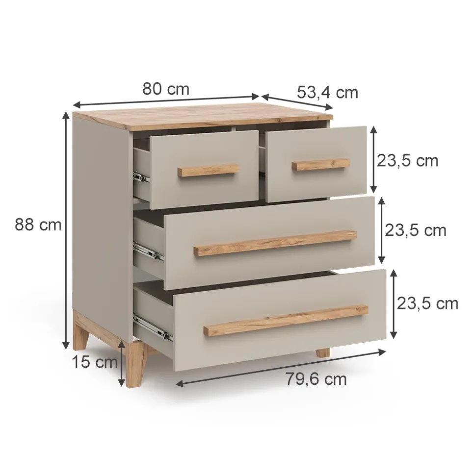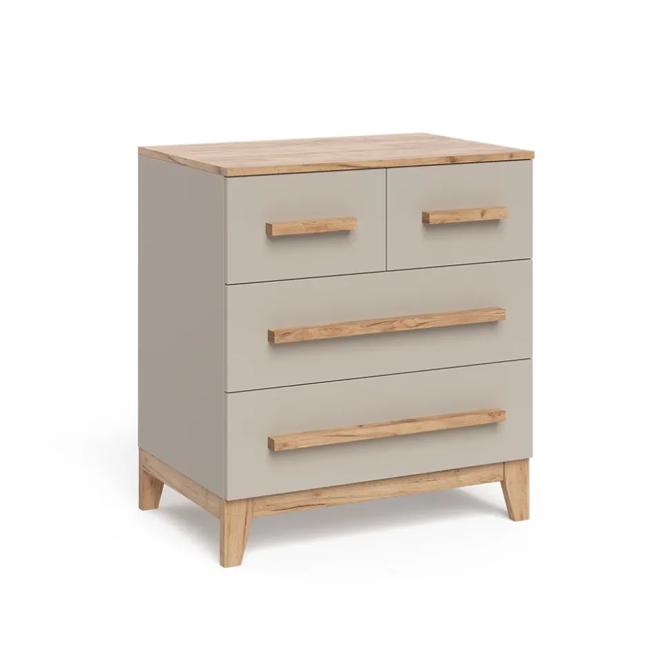 Entdecken Sie die Kommode Malia – mehr als nur ein Möbelstück. Dieses stilvolle Sideboard ist der perfekte Ort, um Ihre wertvollen Dinge zu verstauen und gleichzeitig Ordnung zu schaffen. Mit zwei kleinen und zwei großen Schubladen bietet es ausreichend Platz für Hygieneartikel, Spielzeug oder andere Schätze, die das Leben lebenswert machen. Stellen Sie sich vor, wie Sie jeden Morgen Ihre liebsten Dinge in dieser eleganten Anrichte finden und der Tag gleich viel heller beginnt. Die Kommode Malia ist nicht nur ein praktisches Aufbewahrungsmöbel, sondern auch ein vertrauenswürdiger Begleiter für Ihre schönsten Erinnerungen – perfekt kombinierbar mit anderen Möbeln der Malia-Serie.