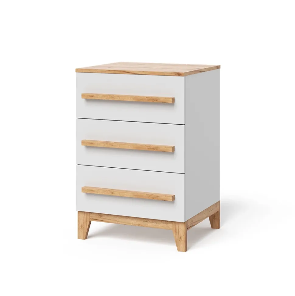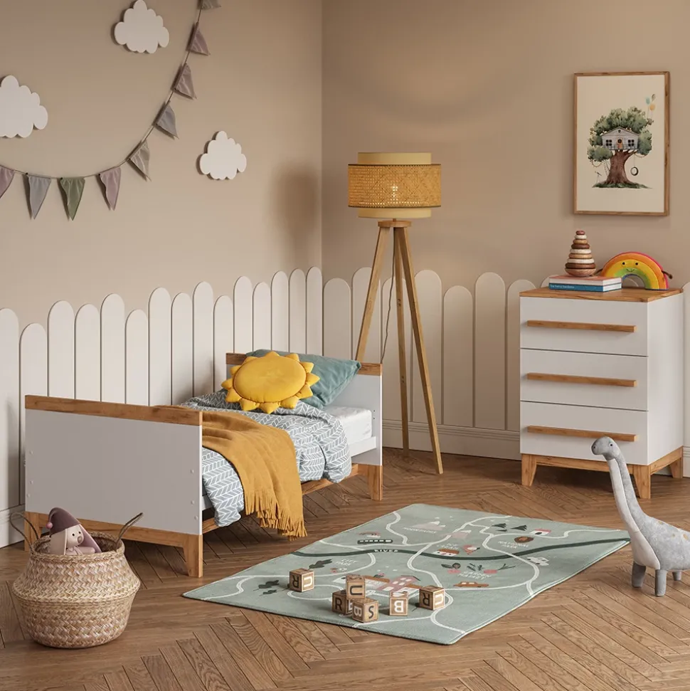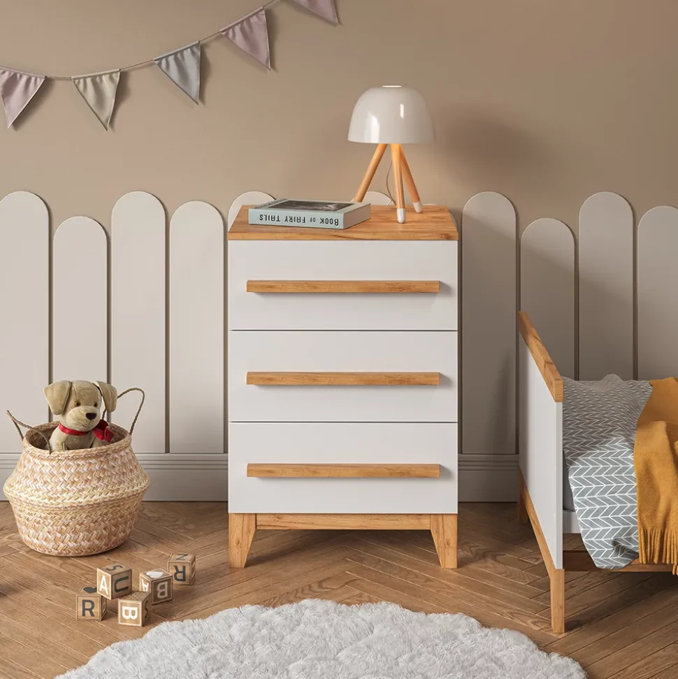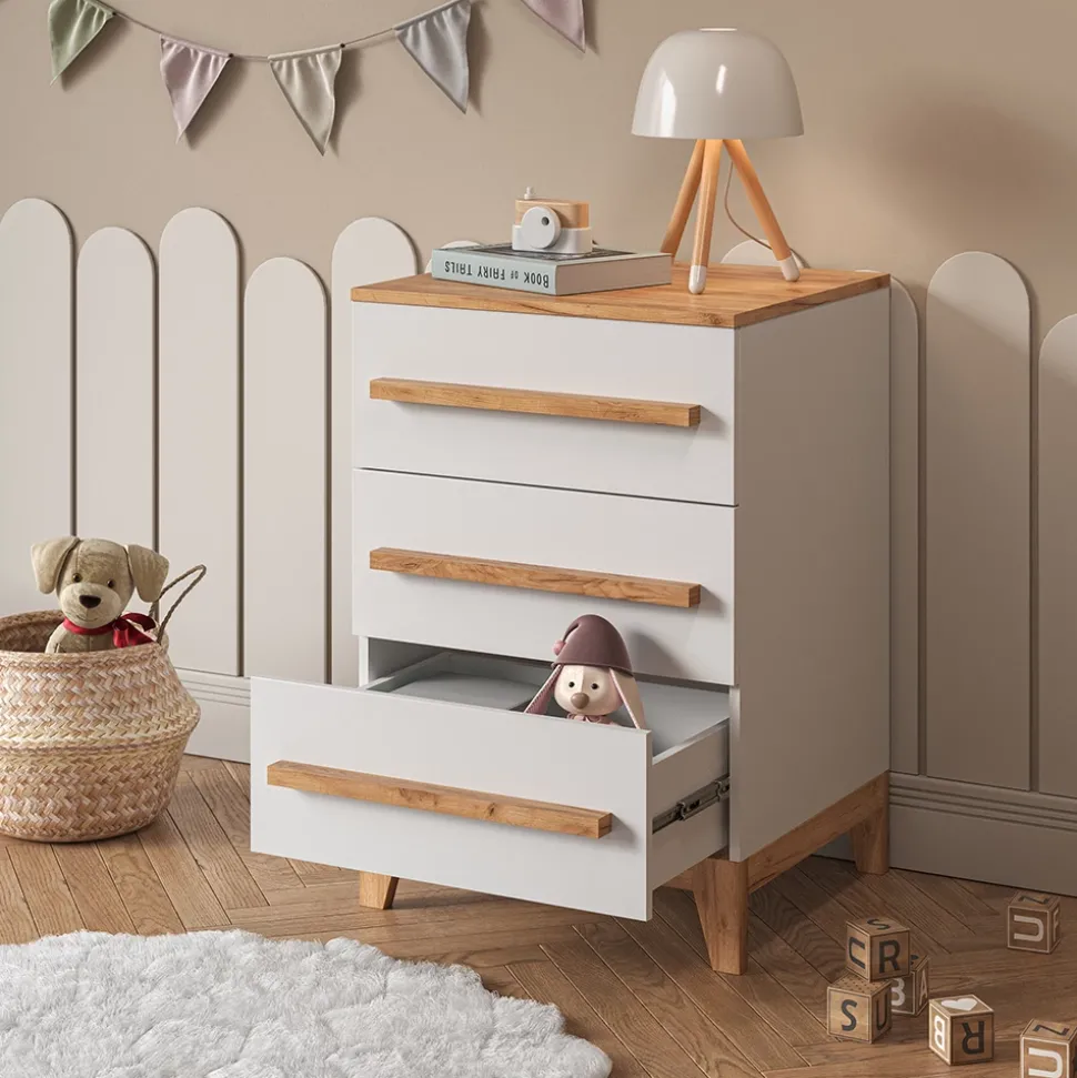 Die Kommode Malia ist der perfekte Begleiter für das Kinderzimmer und vereint elegantes Design mit praktischer Funktionalität. Mit ihren drei geräumigen Schubladen bietet sie ausreichend Platz für Spielzeug, Kleidung und Erinnerungsstücke, die das Wachstum Ihres Kindes begleiten. Stellen Sie sich vor, wie Ihr Kind seine Schätze in dieser stilvollen Anrichte organisiert und so spielerisch Verantwortung lernt. Der Kommodenschrank harmoniert wunderbar mit anderen Möbeln der gleichnamigen Serie und schafft eine einladende Atmosphäre – ein Ort, an dem Erinnerungen entstehen und Träume wachsen. Lassen Sie die Fantasie Ihres Kindes in einem liebevoll gestalteten Raum blühen!