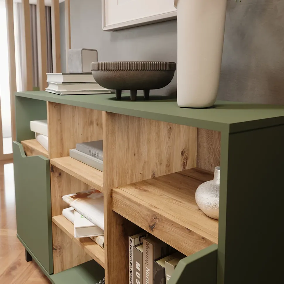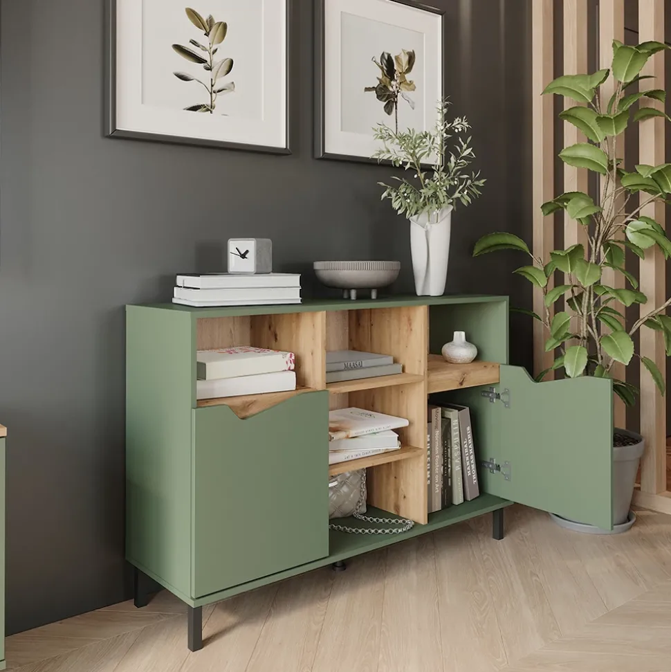 Die Kommode Marelle ist nicht nur ein praktisches Möbelstück für Ihr Zuhause, sondern auch ein echtes Stauraumwunder. Mit seinem Sideboard-Design und den Regalen mit Türen bietet es genügend Platz, um all Ihre Habseligkeiten ordentlich zu verstauen. Der Kommodenschrank ist nicht nur funktional, sondern verleiht Ihrem Wohnraum auch eine elegante Note. Stellen Sie sich vor, wie Sie beim Öffnen der Türen Ihre Lieblingsstücke ordentlich geordnet vorfinden und wie die Marelle Kommode Ihr Zuhause in neuem Glanz erstrahlen lässt. Gönnen Sie sich dieses Möbelstück und machen Sie Ihr Zuhause noch gemütlicher und einladender.