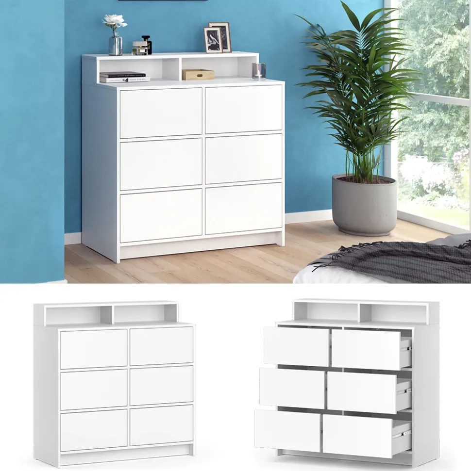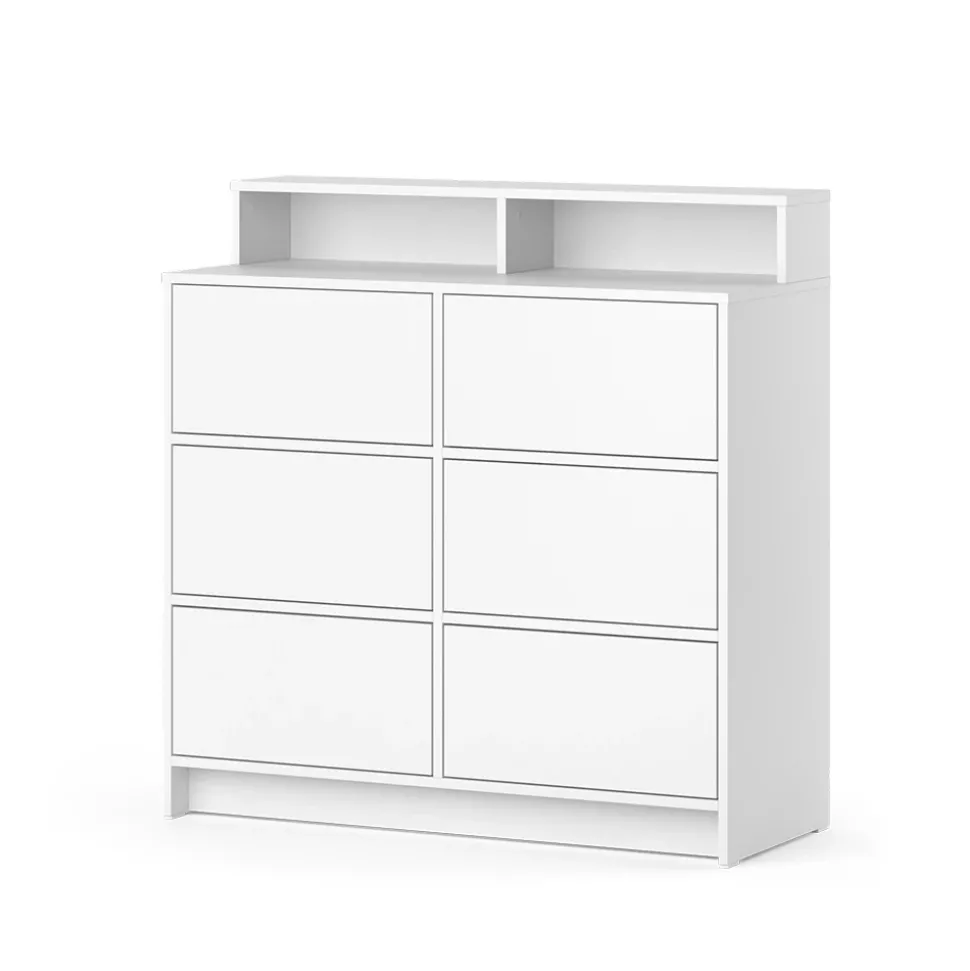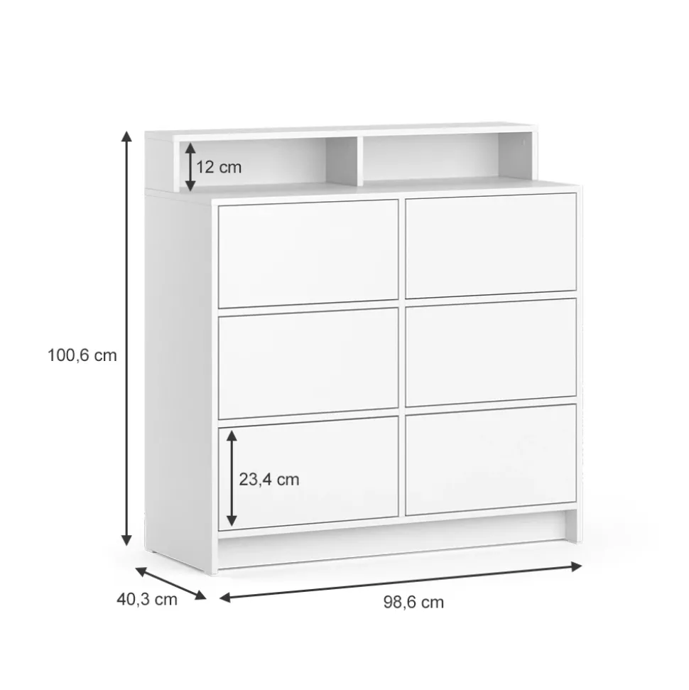Die Naara-Kommode besticht durch ihr schlichtes, modernes Design in zeitlosem Weiß und fügt sich harmonisch in jedes Wohnambiente ein. Mit 6 Schubladen und Fächern bietet die Kommode viel Stauraum für Ihre persönlichen Gegenstände. Schubladen einfach per „Push-to-open“ öffnen und schließen. Kein lästiges Ziehen mehr – einfach sanft antippen und sie gleitet wie von selbst auf. Die Kommode ist ein Teil der Möbelserie Naara und lässt sich perfekt mit anderen Möbelstücken der Serie kombinieren.
