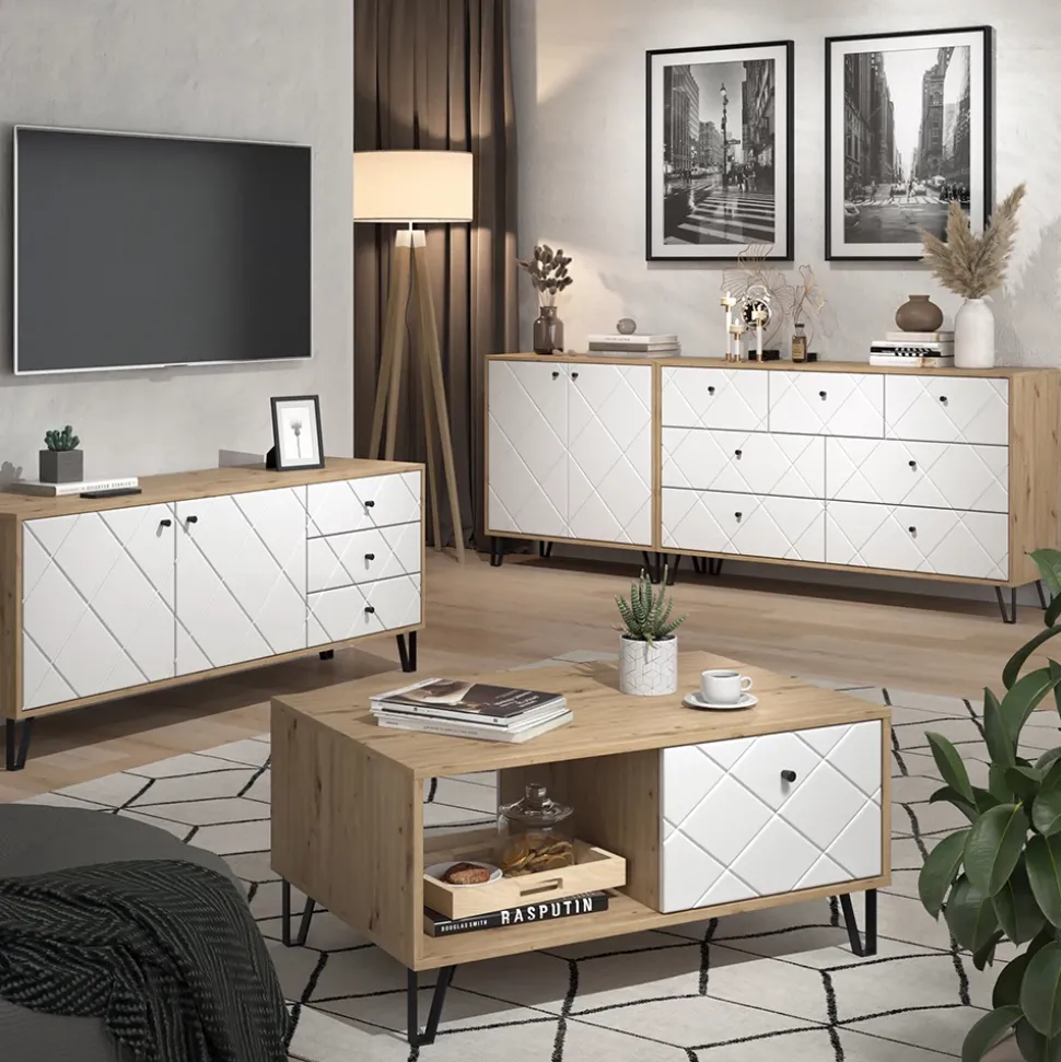 Die Möbelserie „Nizza“ bietet elegante Couchtische und stilvolle Kommoden, die mit ihrem modernen Design und funktionalen Eigenschaften eine ansprechende Ergänzung für Ihr Zuhause darstellen. Mit „Nizza“ schaffen Sie eine stilvolle und praktische Atmosphäre, die sowohl zum Entspannen als auch zur Aufbewahrung dient.