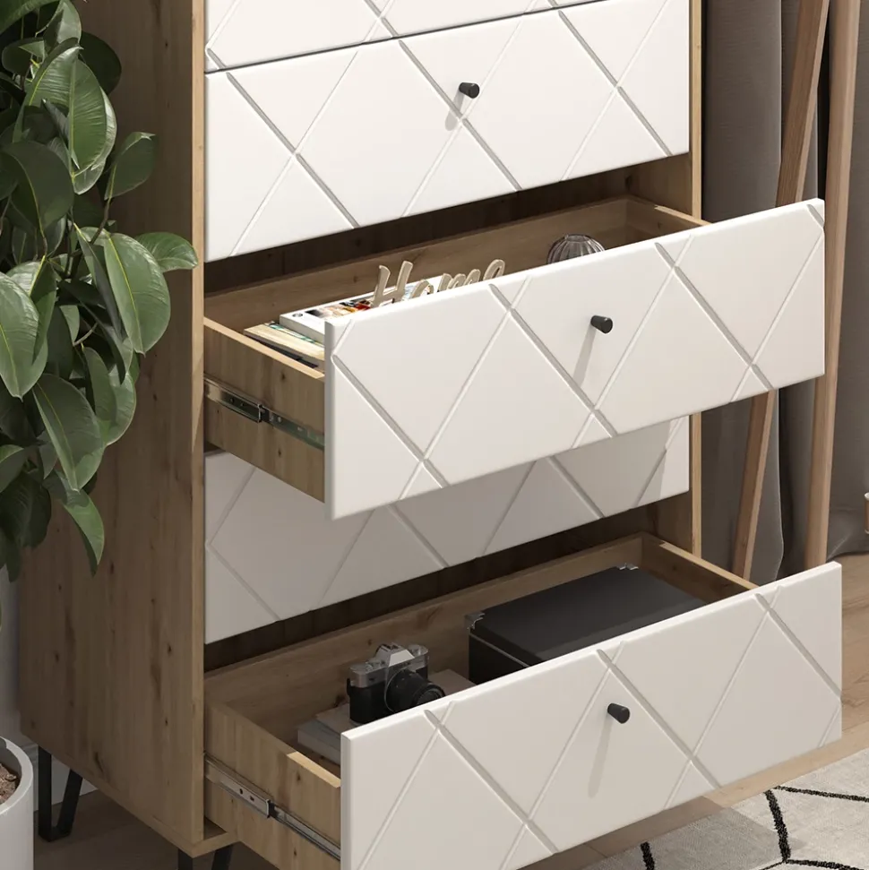 - Stilvolle Anrichte mit fünf geräumigen Schubladen – ideal für Kleidung, Dokumente oder Alltagsgegenstände, sorgt für viel Stauraum und Ordnung.