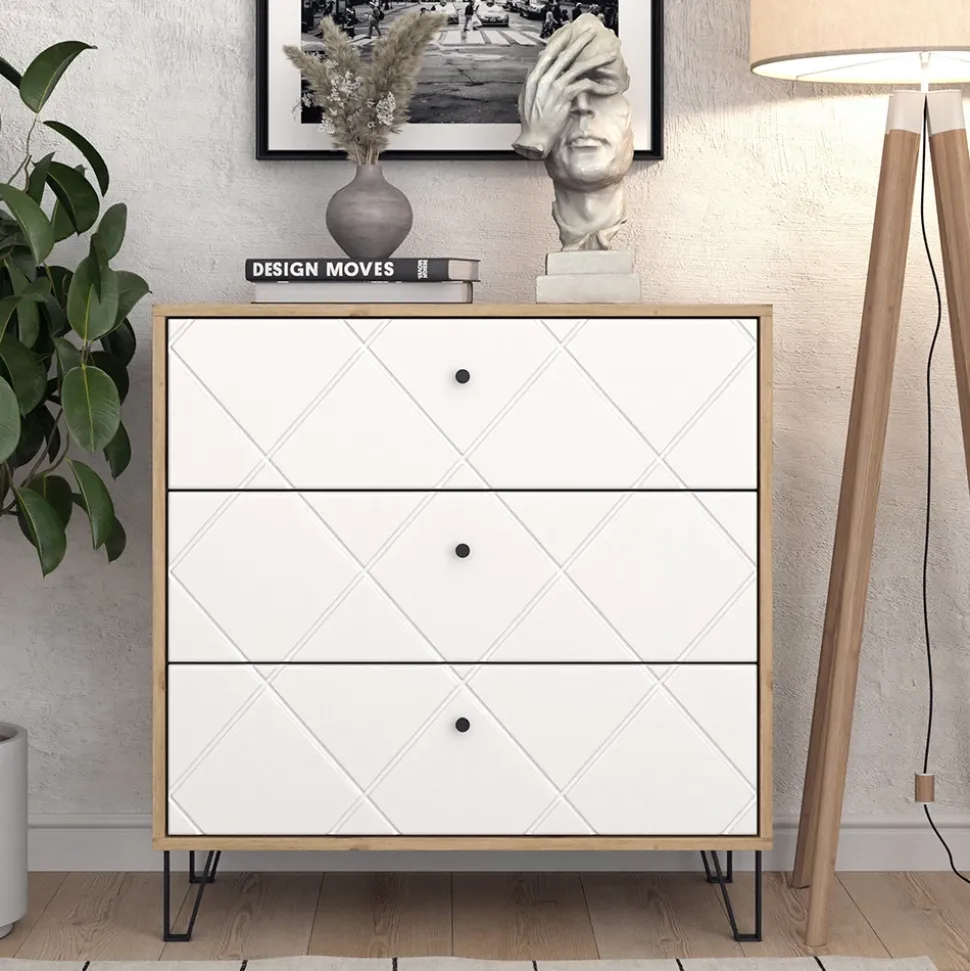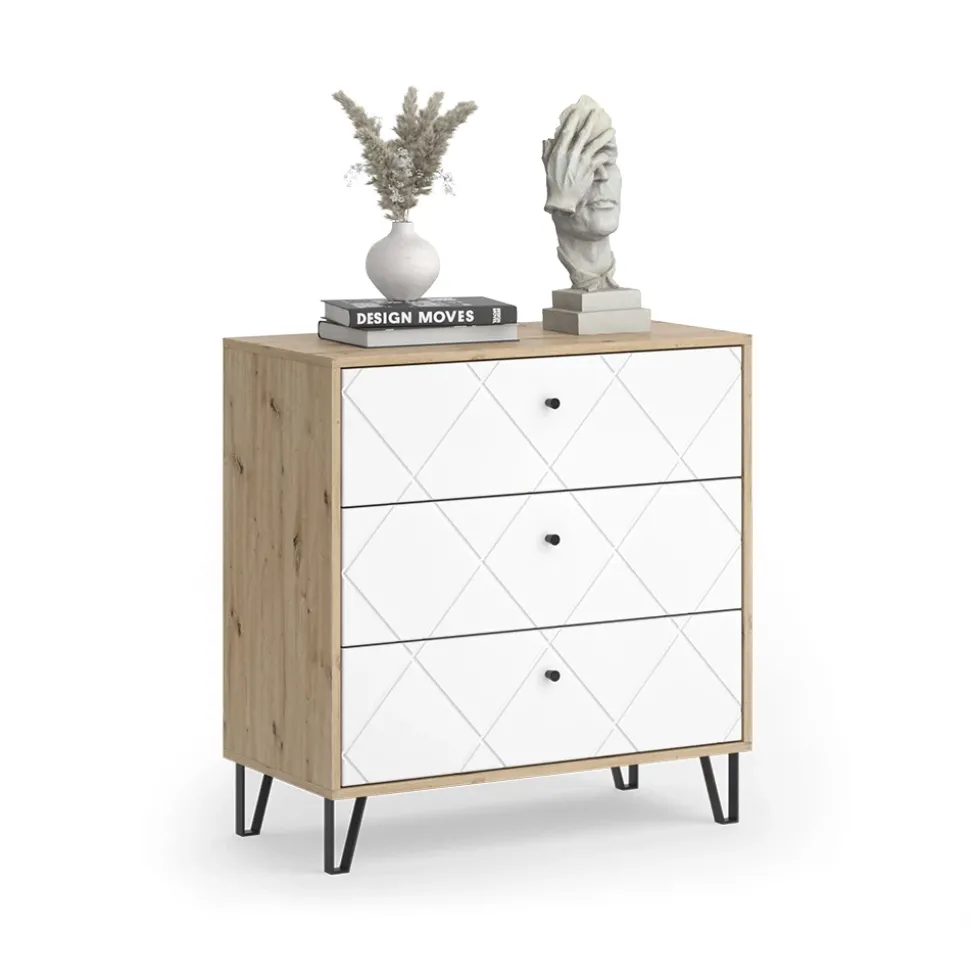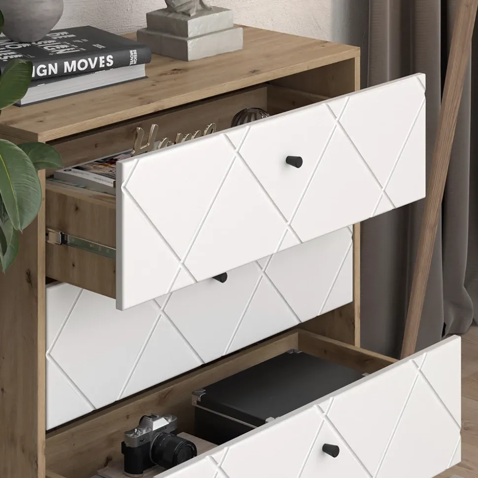 - Stilvolle Anrichte mit drei geräumigen Schubladen – ideal für Kleidung, Bücher oder Alltagsgegenstände, sorgt für Ordnung und ein elegantes Wohnambiente.