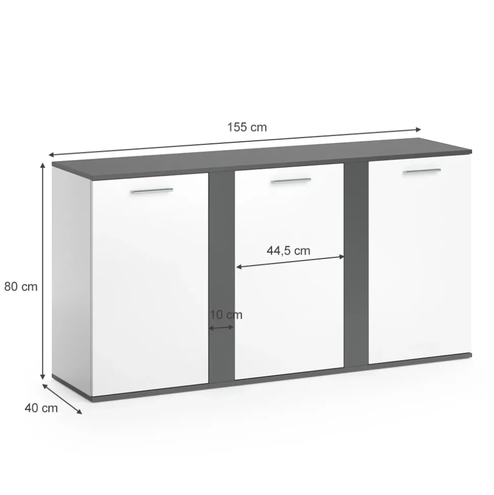 - MAßE: Die Kommode mit Türen hat eine Breite von 155 cm, eine Höhe von 80 cm und eine Tiefe von 40 cm. Alle detaillierten Größen sind auf den Fotos angegeben.