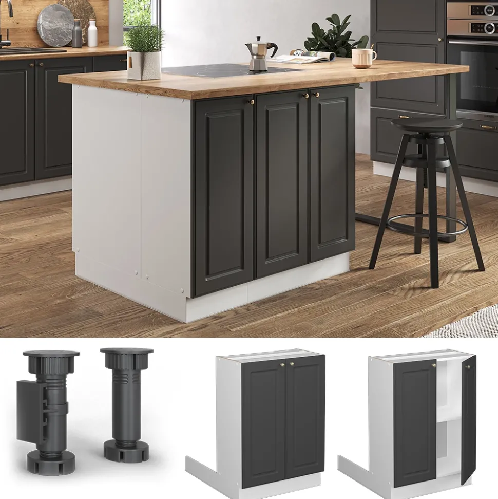 LIEFERUMFANG: Kücheninsel (Sofern nicht anders angegeben, gehören die Arbeitsplatten, Elektrogeräte und Dekoration nicht zum Lieferumfang), Montageanleitung, Montagematerial