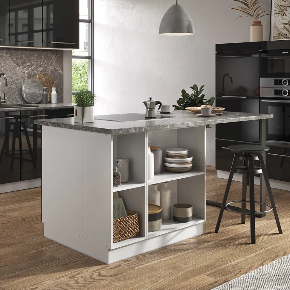 LIEFERUMFANG: Kücheninsel (Sofern nicht anders angegeben, gehören die Arbeitsplatten, Elektrogeräte und Dekoration nicht zum Lieferumfang), Montageanleitung, Montagematerial