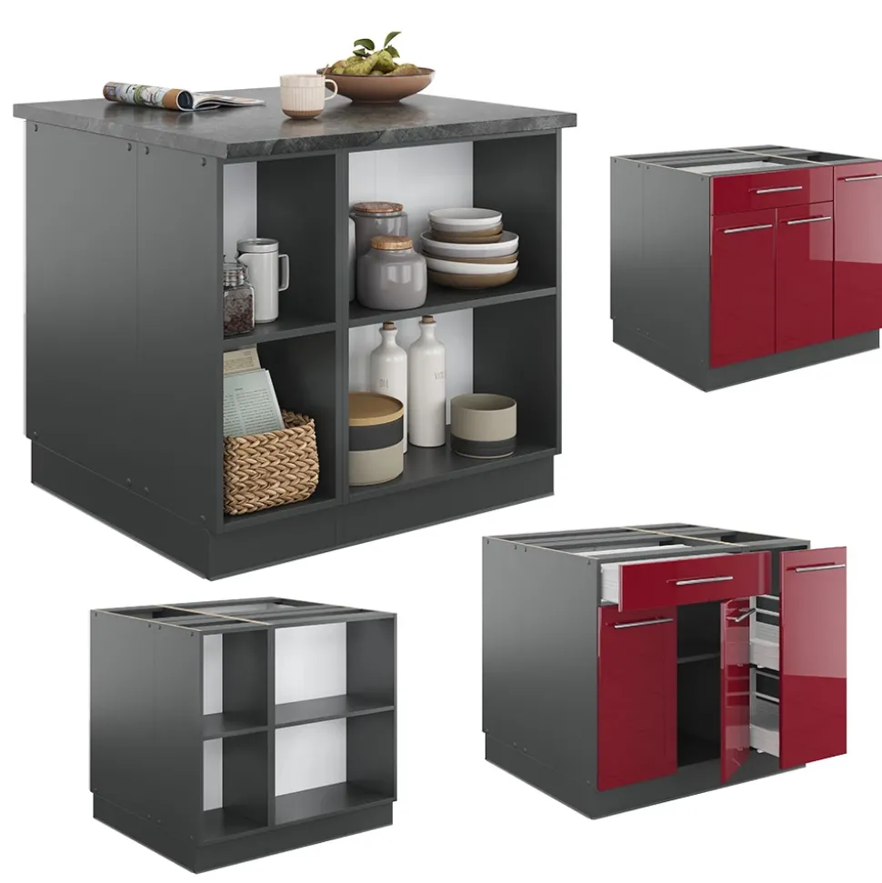 LIEFERUMFANG: Kücheninsel (Sofern nicht anders angegeben, gehören die Arbeitsplatten, Elektrogeräte und Dekoration nicht zum Lieferumfang), Montageanleitung, Montagematerial