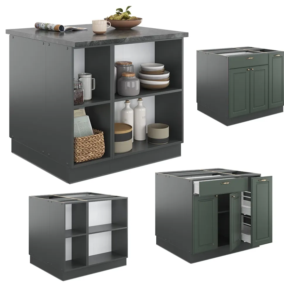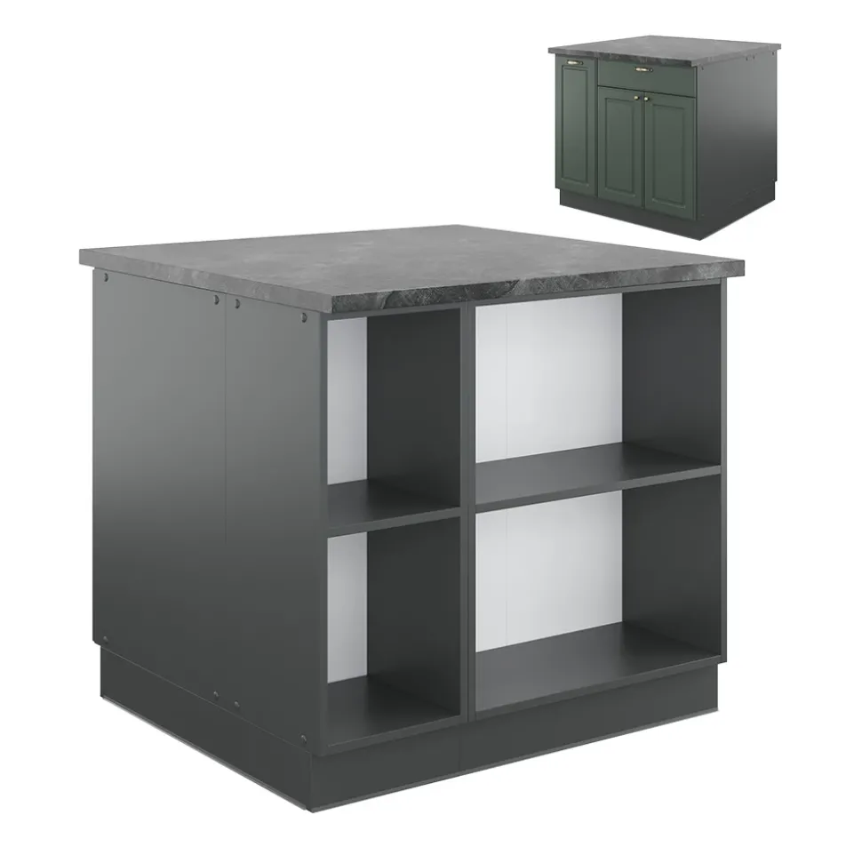 - MAßE: Der Insel-Küchenschrank hat eine Breite von 90 cm, eine Höhe von 82 cm und eine Tiefe von 82 cm. Alle detaillierten Größen sind auf den Fotos angegeben.