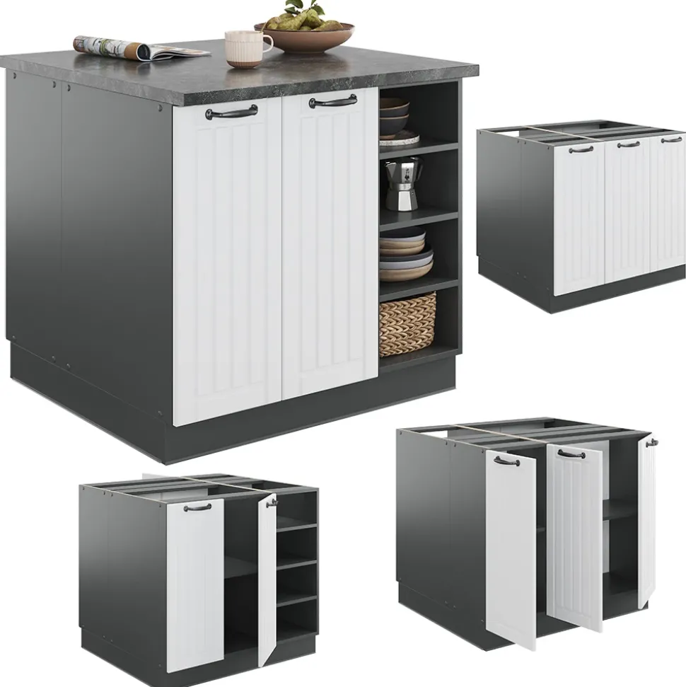 LIEFERUMFANG: Kücheninsel (Sofern nicht anders angegeben, gehören die Arbeitsplatten, Elektrogeräte und Dekoration nicht zum Lieferumfang), Montageanleitung, Montagematerial