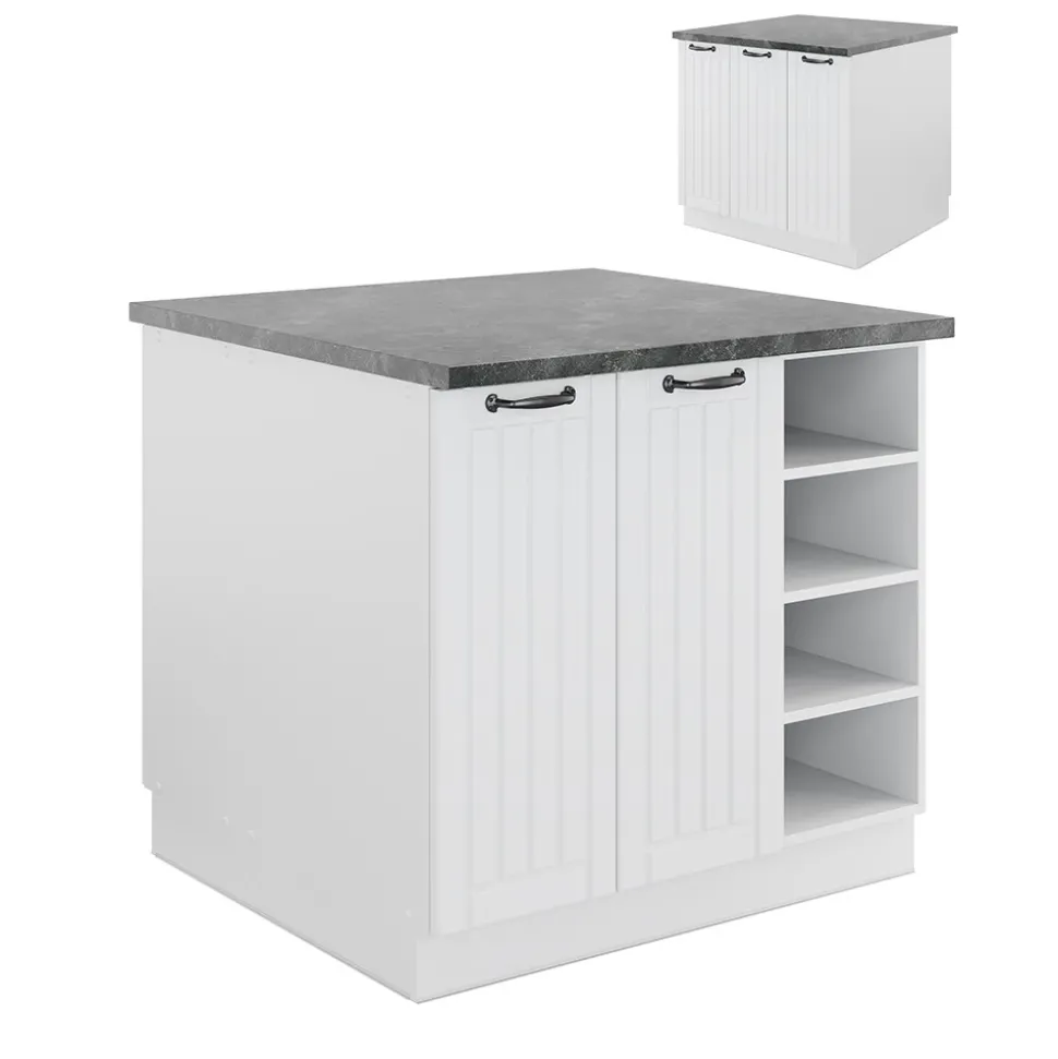 LIEFERUMFANG: Kücheninsel (Sofern nicht anders angegeben, gehören die Arbeitsplatten, Elektrogeräte und Dekoration nicht zum Lieferumfang), Montageanleitung, Montagematerial