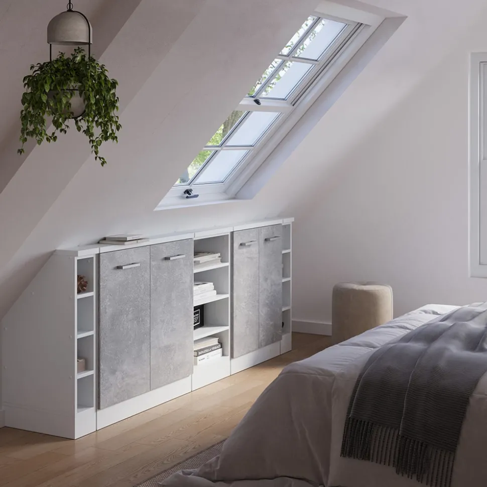 - Diese Dachschrägenzeile bietet geräumige, geschlossene Schränke und offene Seitenregale für maximalen Stauraum; die Konstruktion gewährleistet lange Haltbarkeit und Stabilität.