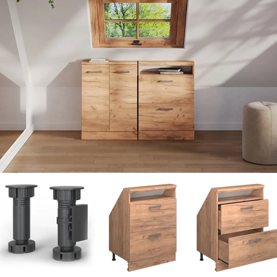 - Robuster Küchenschrank für Dachschrägen mit 2 Schubladen. Praktische Griffe und viel Stauraum machen ihn zu einer platzsparenden, langlebigen Lösung für Ihre Küche.