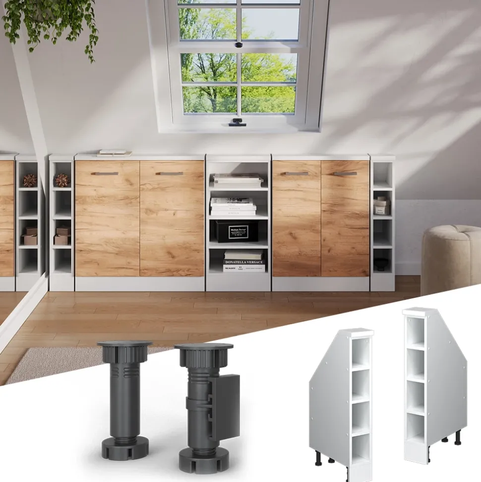 Verwandeln Sie ungenutzten Platz unter der Dachschräge in funktionalen und stilvollen Stauraum – mit dem R-Line Küchenschrank für Dachschrägen. Das speziell konzipierte Möbel fügt sich passgenau unter die Schräge und bietet reichlich Stauraum für alles, was Sie in der Küche verstauen möchten. Die der Dachneigung angepasste Oberseite sorgt für eine moderne Optik, höhenverstellbare, verdeckt eingelassene Füße runden das nahtlose Erscheinungsbild ab und gewährleisten sicheren Stand. Bringen Sie Ordnung in Ihre Küche und gewinnen Sie auf clevere Weise zusätzlichen Stauraum – mit dem R-Line Dachschrägenschrank.