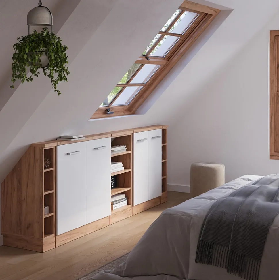 - Diese Dachschrägenzeile bietet geräumige, geschlossene Schränke und offene Seitenregale für maximalen Stauraum; die Konstruktion gewährleistet lange Haltbarkeit und Stabilität.