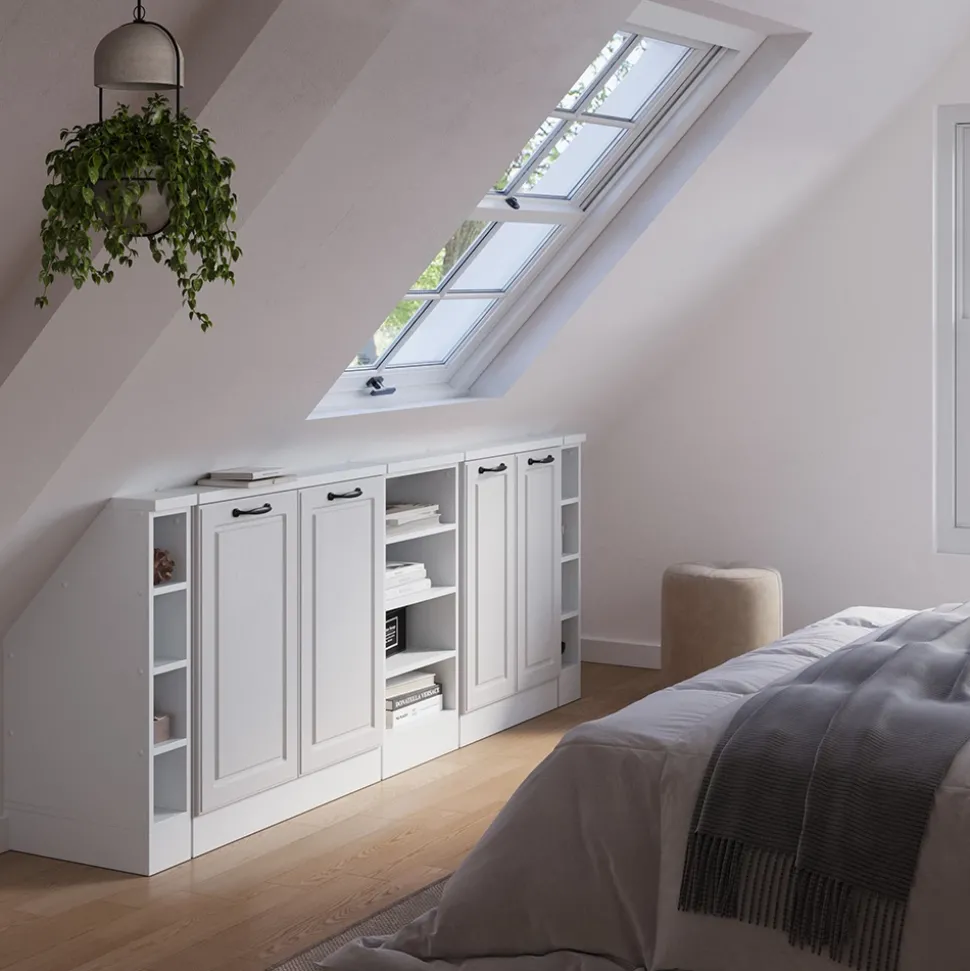 - Diese Dachschrägenzeile bietet geräumige, geschlossene Schränke und offene Seitenregale für maximalen Stauraum; die Konstruktion gewährleistet lange Haltbarkeit und Stabilität.
