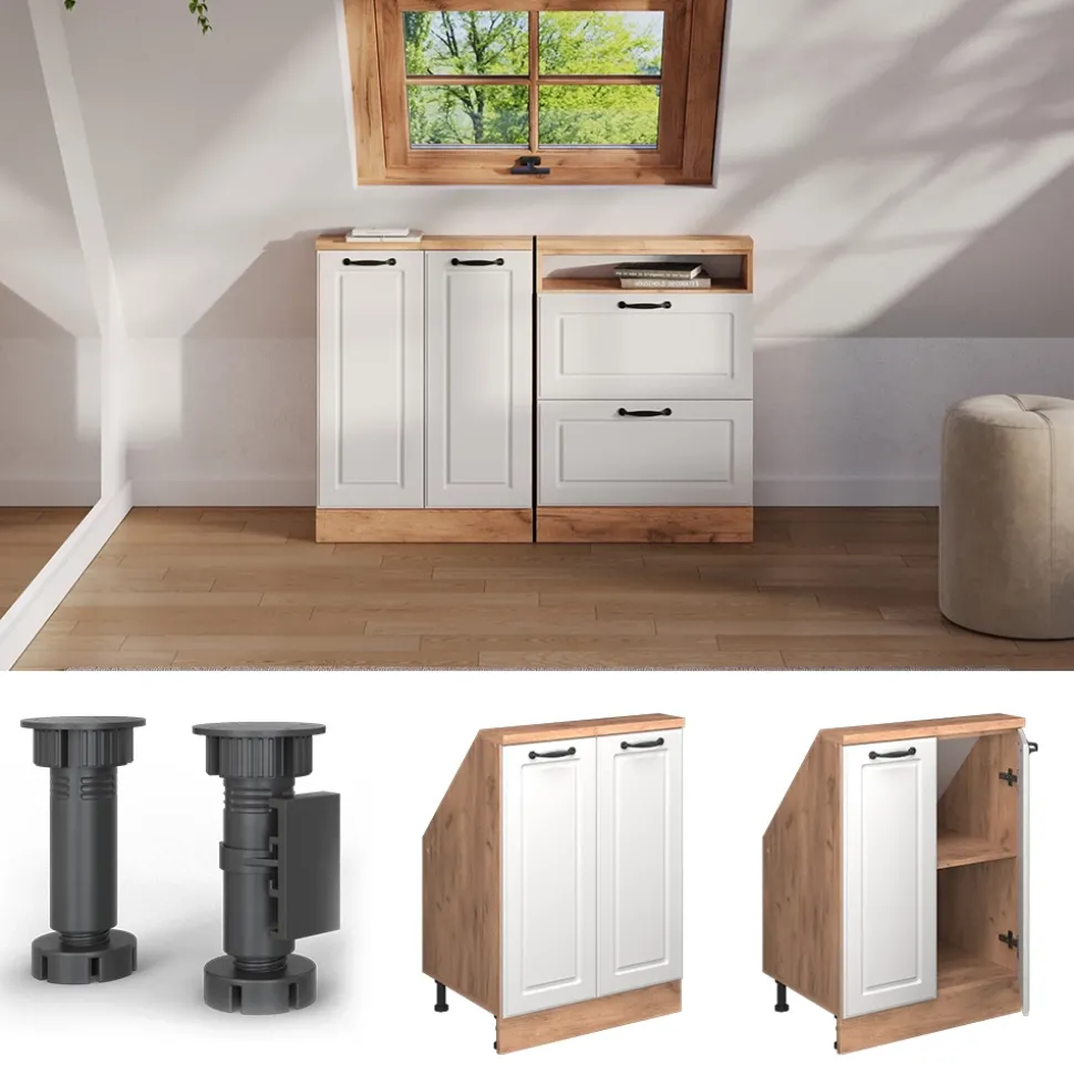 - Robuster Küchenschrank für Dachschrägen mit 2 Türen. Praktische Griffe und viel Stauraum machen ihn zu einer platzsparenden, langlebigen Lösung für Ihre Küche.