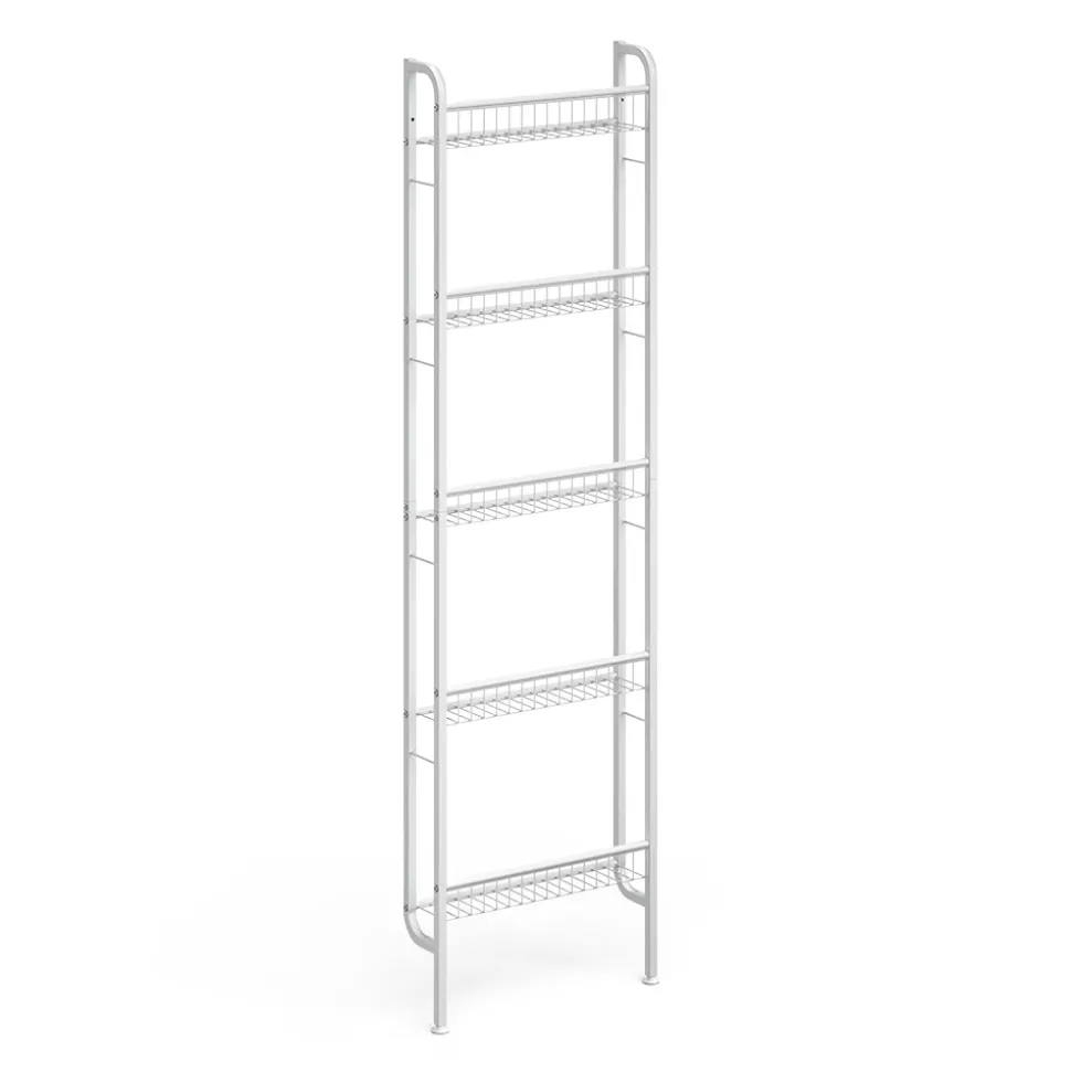 Dieses schlanke Metall-Standregal „Klivo “ bringt Ordnung in Küche, Bad oder Vorratsraum und passt dank nur ca. 11 cm Tiefe selbst in schmale Nischen. Als vielseitiges Leiterregal, Wandregal oder Stufenregal eingesetzt, bietet es 5 robuste Gitterablagen für Gläser, Handtücher, Gewürze oder Putzmittel. Der stabile Metallrahmen gewährleistet dauerhafte Standfestigkeit, während das minimalistische Design dezent zu modernen wie klassischen Interieurs passt. Mit seiner leichten Konstruktion bleibt es mobil und lässt sich schnell umstellen oder reinigen. So nutzt du deinen Raum platzsparend und elegant – für klare Strukturen auf kleinstem Raum.