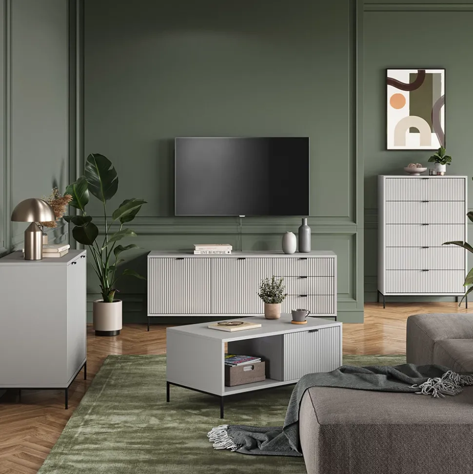 Das Lowboard Eliza ist die perfekte Lösung, um Ihren Fernseher stilvoll in Szene zu setzen und gleichzeitig für Ordnung im Wohnzimmer zu sorgen. Das moderne Design und die Funktionalität des TV-Schranks machen ihn zu einem echten Blickfang in jedem Wohnzimmer. Mit ausreichend Stauraum bietet das Lowboard genügend Platz für Ihre Technik und Multimedia-Zubehör. Zudem lässt sich das TV-Board optimal mit anderen Möbeln aus der Eliza-Kollektion kombinieren, um ein harmonisches Gesamtbild zu schaffen. Verleihen Sie Ihrem Zuhause mit dem Lowboard Eliza einen Hauch von Eleganz und Gemütlichkeit.