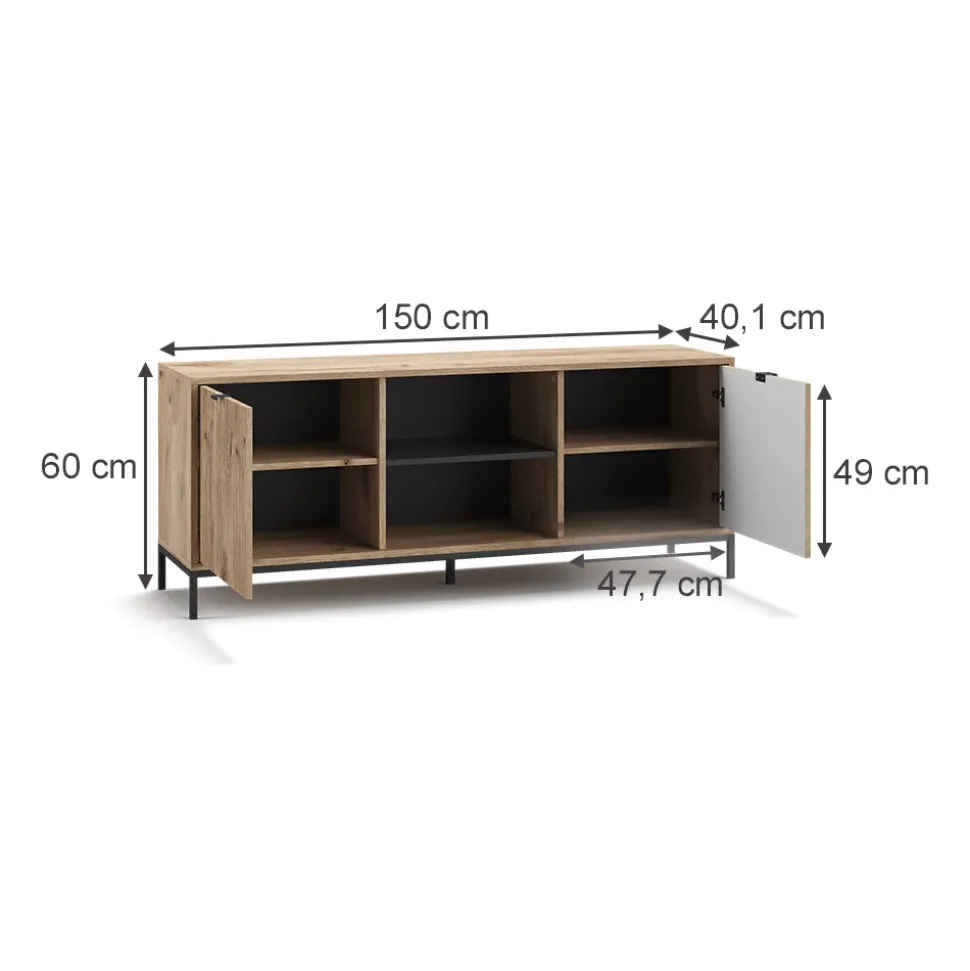 - MAßE: Der TV-Schrank hat folgende Abmessungen: Breite: 150 cm, Höhe: 60 cm, Tiefe: 40,1 cm. Alle detaillierten Größen sind auf den Fotos angegeben.