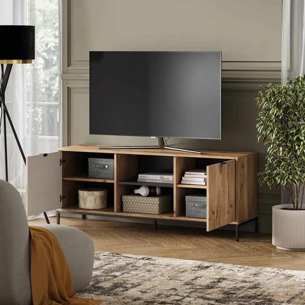 - MATERIAL: Das TV-Board besteht aus pflegeleichter, melaminharzbeschichteter 16 mm Spanplatte. Die Fronten sind aus MDF gefertigt. Die Griffe und Füße aus Metall.