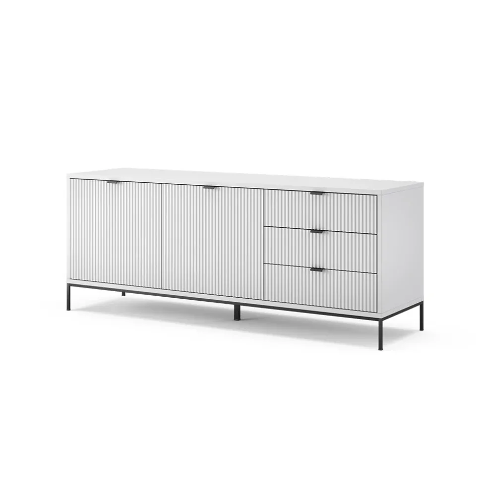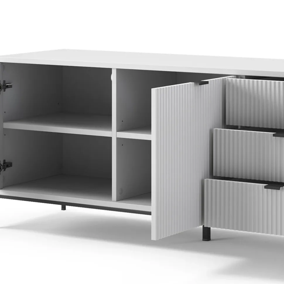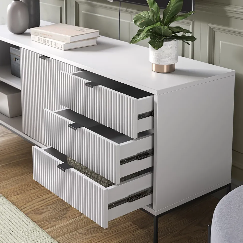 Das TV-Lowboard besticht durch sein modernes Design, welches Ihrem Wohnzimmer einen stilvollen Touch verleiht. Mit ausreichend Platz bietet der Fernsehschrank eine perfekte Präsentationsfläche für Ihren Fernseher. Dank der 3 Schubladen und den insgesamt 4 Fächern hinter 2 Türen haben Sie viel Stauraum für Ihre Multimedia-Geräte samt Zubehör. Die Oberfläche des TV-Schranks ist leicht zu reinigen und pflegeleicht, sodass Sie Ihre Möbel stets in einem makellosen Zustand halten können. Das TV-Lowboard ist Bestandteil unserer Eliza-Möbelserie.