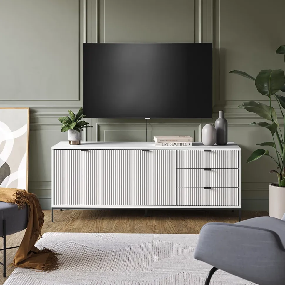 - Dieser Fernsehtisch besticht durch sein modernes Design und bietet viel Stauraum in geschlossenen Fächern.