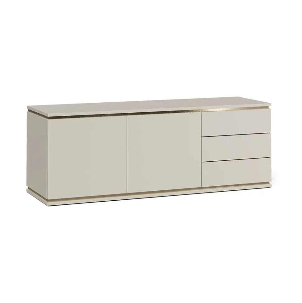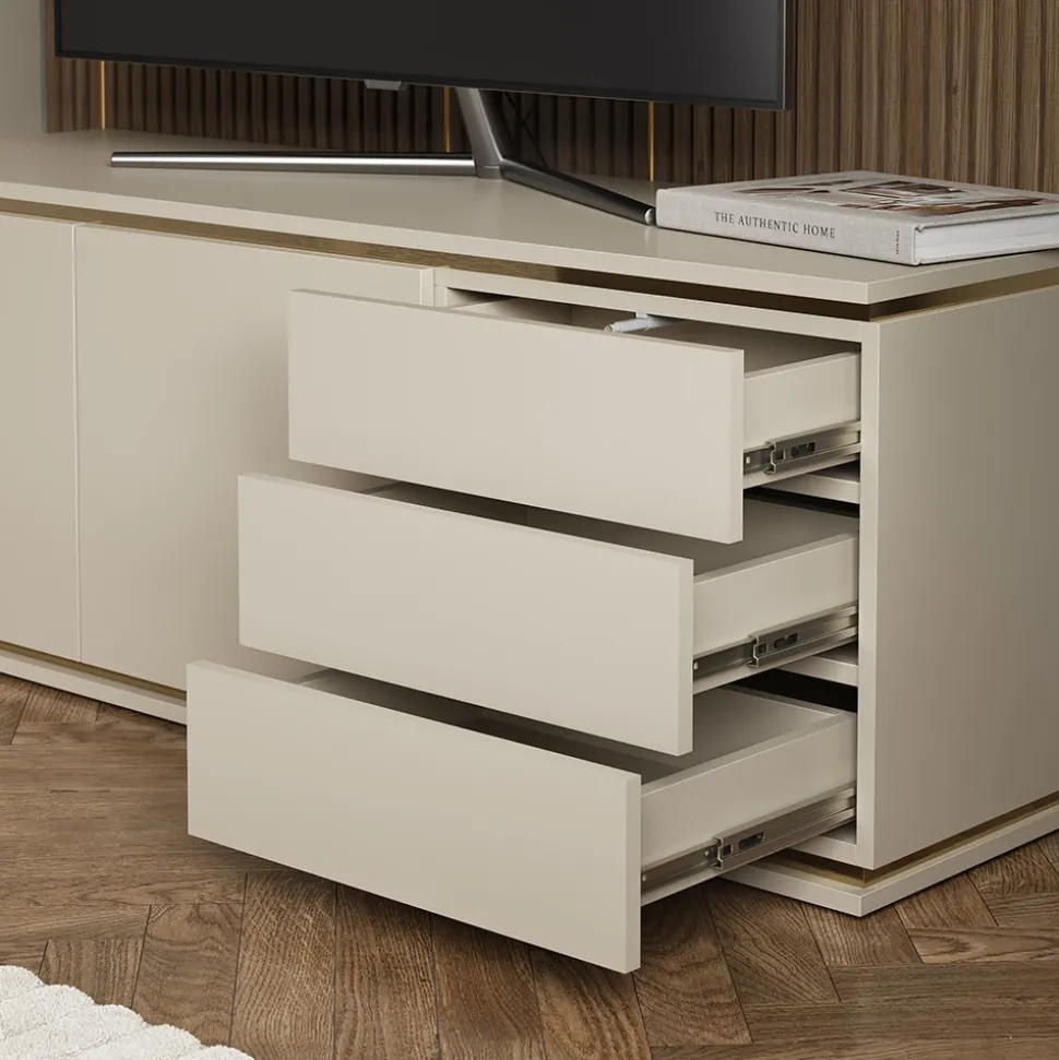 Das Lowboard Linette ist nicht nur ein funktionelles Möbelstück für Ihren Fernseher, sondern auch ein echter Blickfang in Ihrem Wohnzimmer. Mit seinen 2 Türen und 3 Schubladen bietet es ausreichend Stauraum für Ihre DVDs, Spiele und Fernbedienungen. Die Push-to-Open Funktion sorgt für ein modernes und elegantes Design. Kombinieren Sie das TV-Board mit anderen Möbeln der Linette-Serie, um Ihrem Wohnzimmer einen einheitlichen Look zu verleihen. Holen Sie sich mit dem Lowboard Linette nicht nur ein praktisches Möbelstück, sondern auch ein Stück zeitlose Eleganz in Ihr Zuhause.