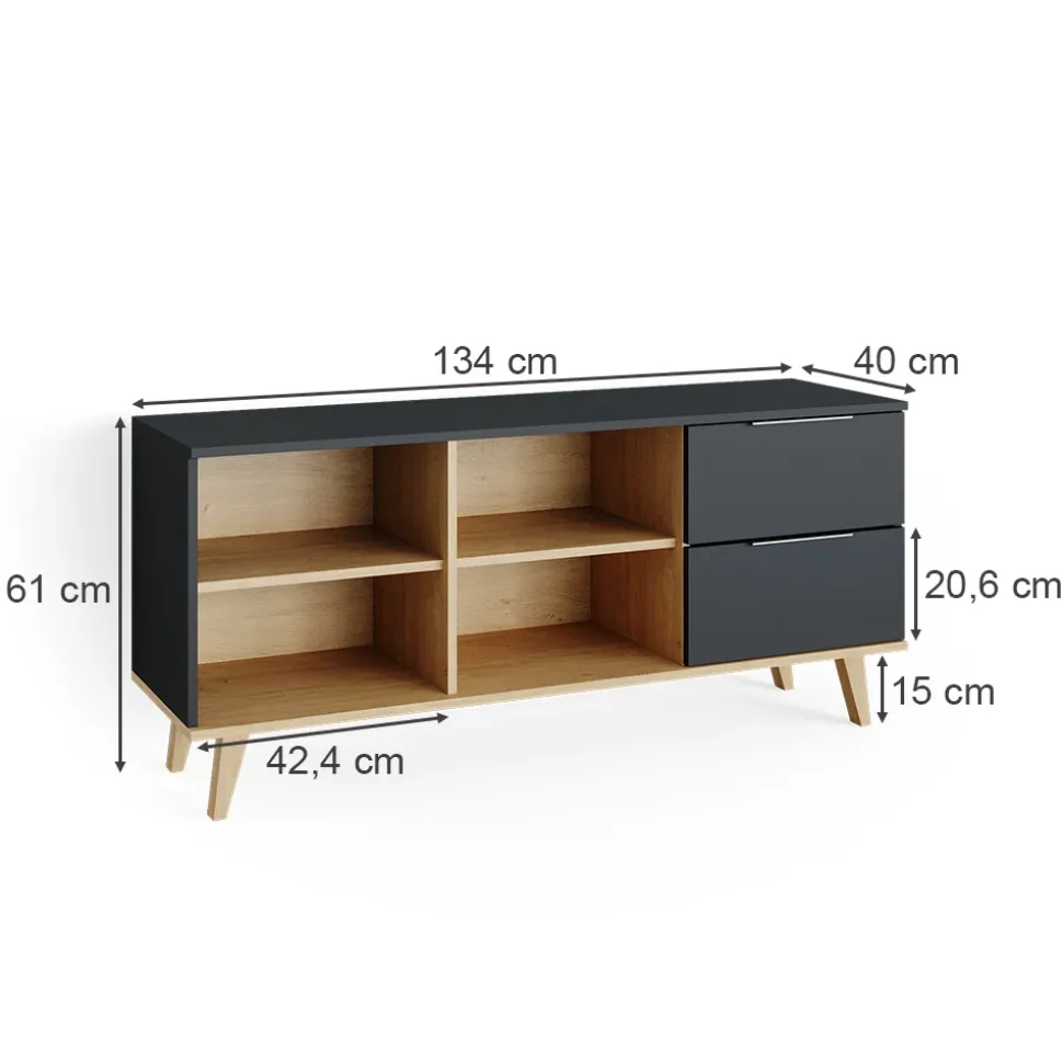 - MAßE: Der TV Schrank hat eine Breite von 134 cm, eine Höhe von 61 cm und eine Tiefe von 40 cm. Alle detaillierten Größen sind auf den Fotos angegeben.