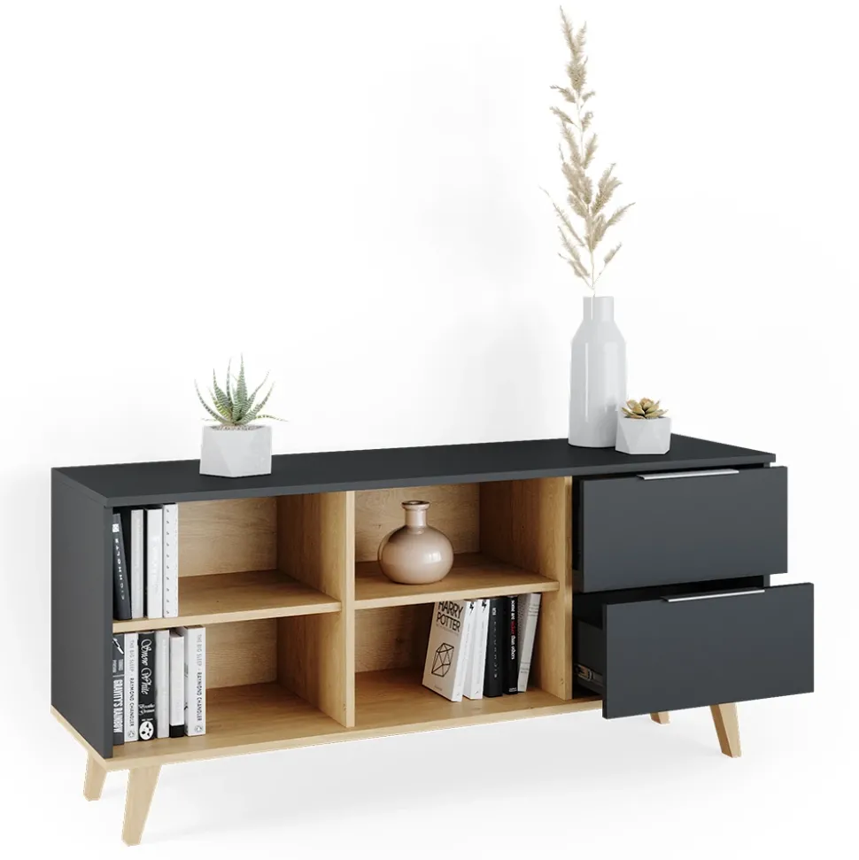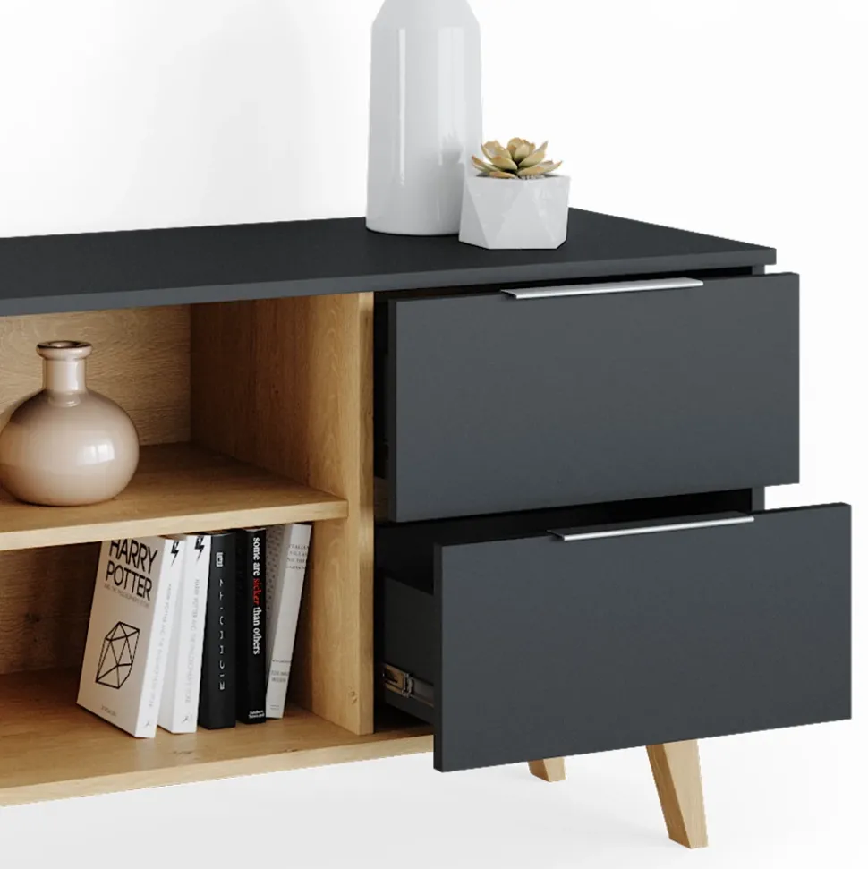 - Der Fernsehtisch Neptun bietet mit 2 Schubladen und offenen Regalen ausreichend Stauraum für TV-Zubehör und verfügt über elegante Füße für einen stilvollen Look.