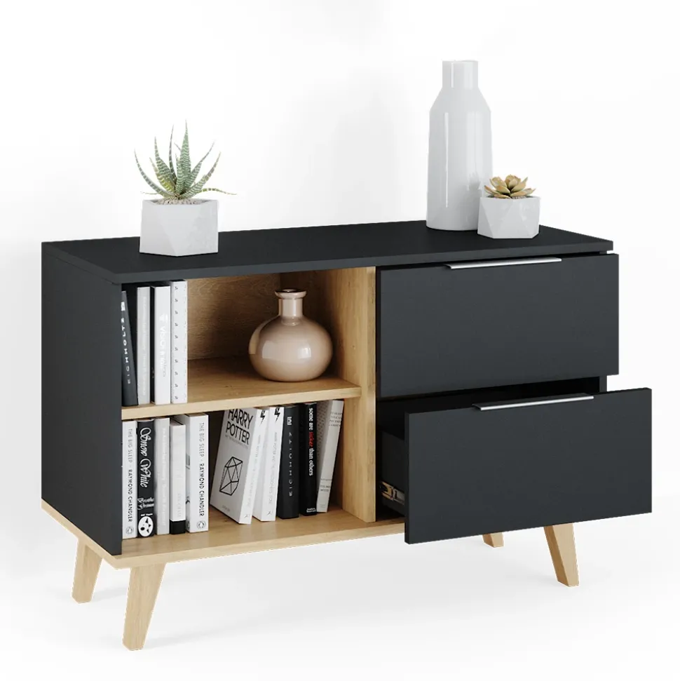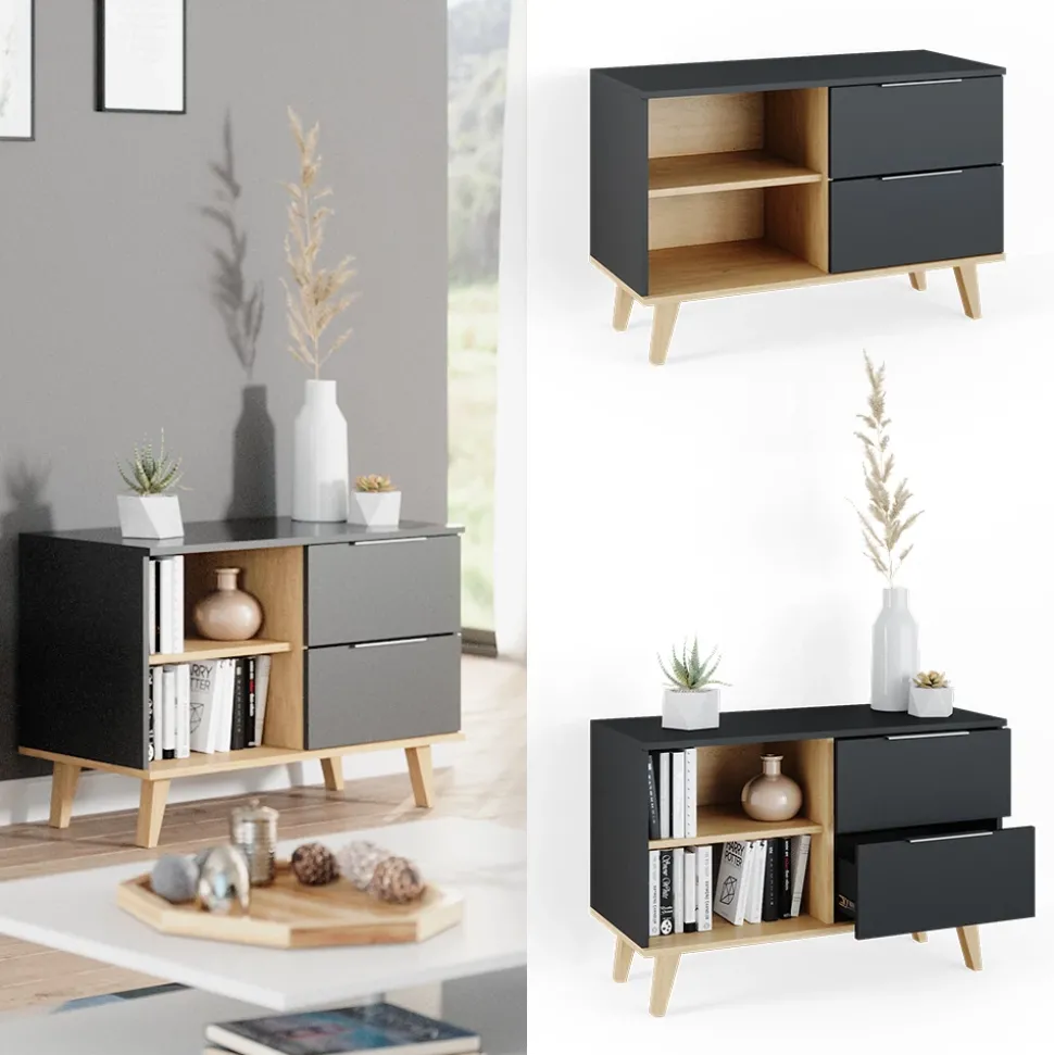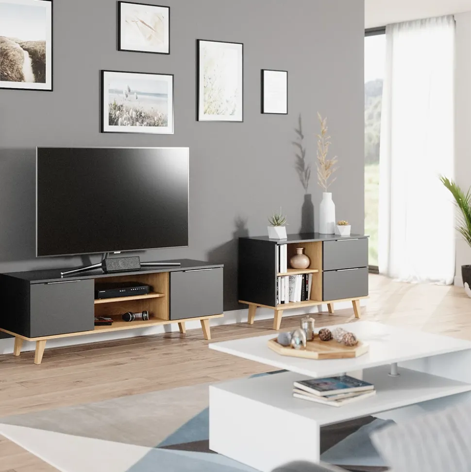 - Der Fernsehtisch Neptun bietet viel Stauraum und ist ideal für das Wohnzimmer. Mit offenen und geschlossenen Ablagefächern ist er praktisch und funktional.