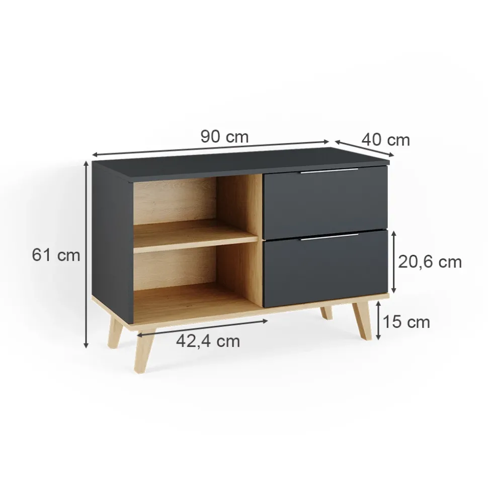 - MAßE: Der TV Schrank hat eine Breite von 90 cm, eine Höhe von 61 cm und eine Tiefe von 40 cm. Alle detaillierten Größen sind auf den Fotos angegeben.