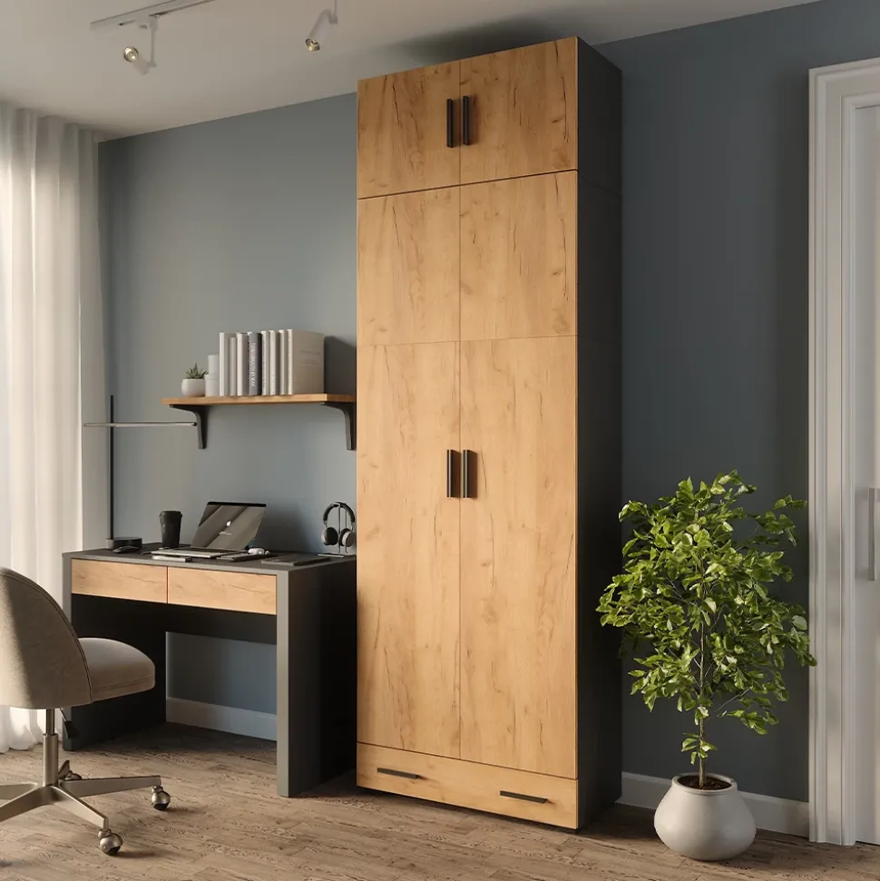 Der Mehrzweckschrank Frank ist der ideale Begleiter für alle, die Ordnung und Stil in ihrem Zuhause schätzen. Mit seinem modernen Design und seinem vielseitigen Einsatzgebiet ist er ein wahres Multitalent. Dank der 2 Zusatzmodule bietet er jede Menge Stauraum für Kleidung, Schuhe, Bücher oder Spielzeug. Egal ob im Flur, Büro, Schlafzimmer oder Kinderzimmer – der Multifunktionsschrank passt sich überall perfekt an und sorgt für Ordnung und Übersicht. Bringen Sie mit diesem praktischen Möbelstück Struktur in Ihr Zuhause und genießen Sie die Vorteile eines gut organisierten Lebens!