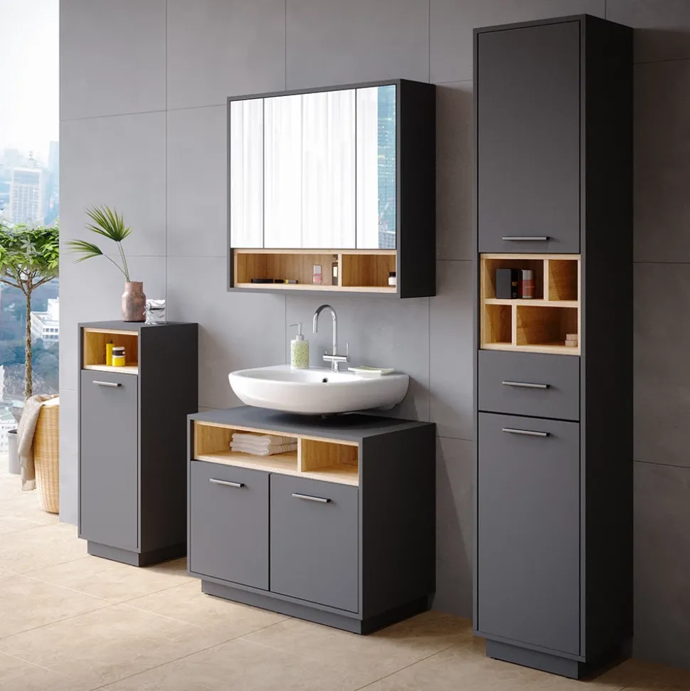 - Das Badmöbel ist ein praktischer Stauraum für alle Badutensilien. Die Flügeltür und das offene Regal bieten ausreichend Platz für alles, was Sie im Bad benötigen.