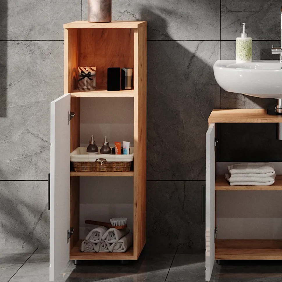 Der Midischrank Irma ist die perfekte Wahl für alle, die ihr Badezimmer stilvoll und funktional gestalten möchten. Das innovative Design mit offenen und geschlossenen Ablageflächen bietet ausreichend Platz für alle Ihre Badutensilien und Accessoires. Das Besondere an diesem Badezimmerschrank ist, dass die Richtung der Türöffnung umgekehrt werden kann, um sich perfekt an Ihre Bedürfnisse anzupassen. Der Midischrank ist außerdem kompatibel mit anderen Produkten der Kollektion Irma, was es Ihnen ermöglicht, Ihr Badezimmer perfekt aufeinander abzustimmen. Egal ob Sie sich für eine klassische oder moderne Einrichtung entscheiden – mit dem Irma Midischrank ist alles möglich.