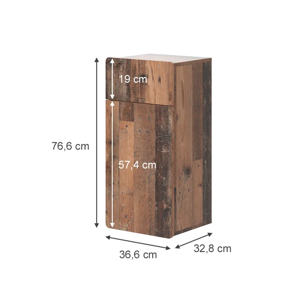 - MAßE: Der Midischrank, mit Schublade und Tür, hat folgende Maße: Tiefe von 32,8 cm, Breite von 36,6 cm und Höhe von 76,6 cm. Alle detaillierten Größen sind auf den Fotos angegeben.