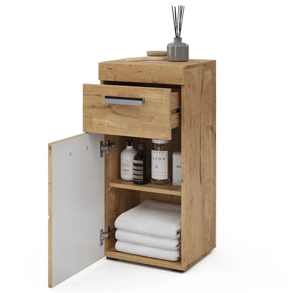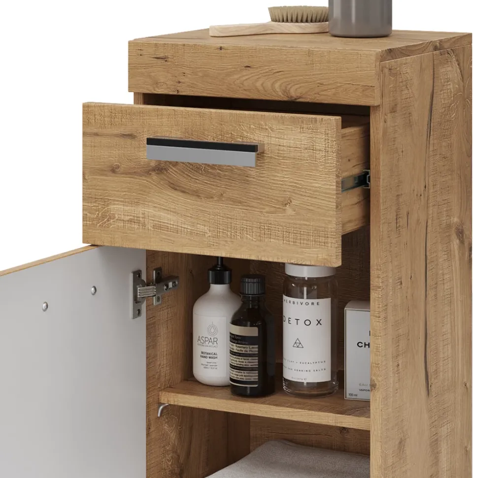 - Das Badmöbel mit einer ausziehbaren Schublade und zwei Ablagen bietet es viel Stauraum und ist eine praktische Lösung für eine organisierte Badezimmeraufbewahrung.