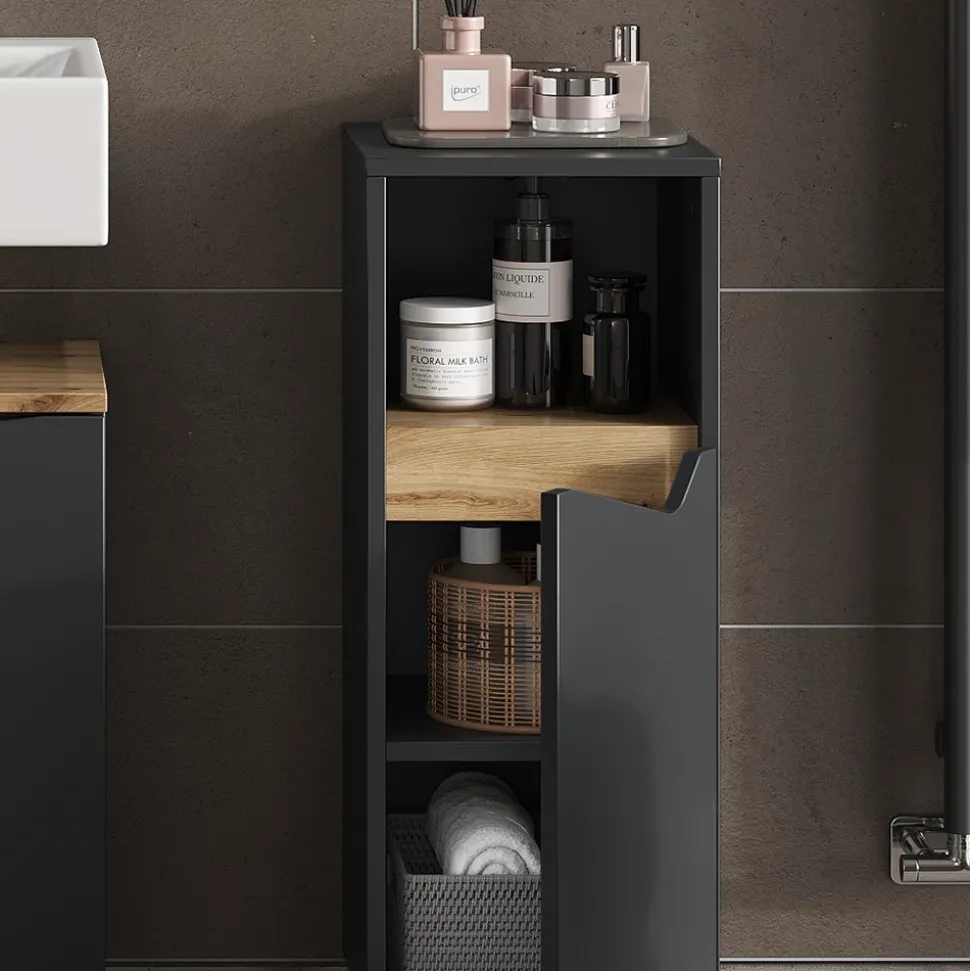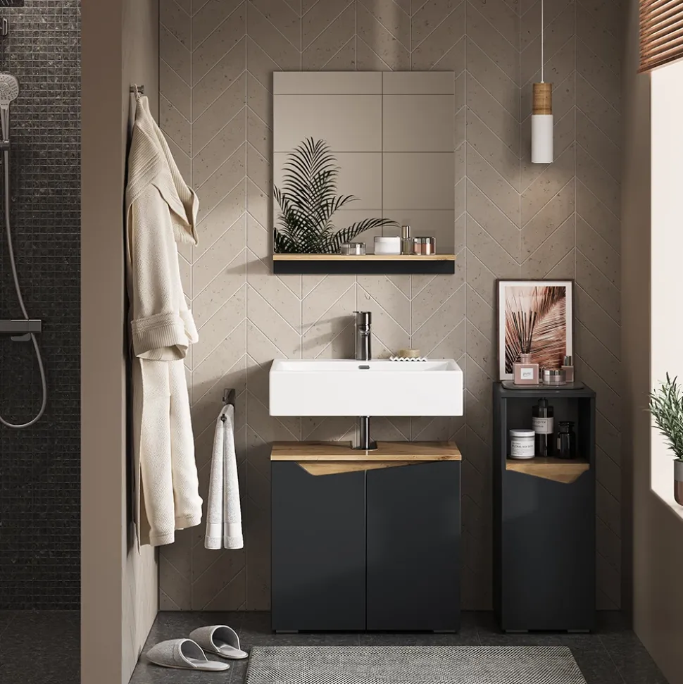- Die Vorteile des Badezimmerschranks sind unübersehbar. Er bietet clevere Aufbewahrungslösungen und passt ideal in enge Räume – die perfekte Ergänzung zu den anderen Badmöbeln unserer Marelle-Serie.