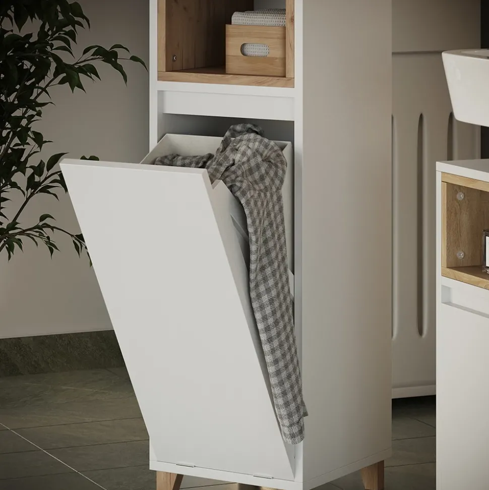 Der Midischrank Elnor ist nicht nur ein praktisches Möbelstück für Ihr Badezimmer, sondern ein echtes Design-Highlight! Mit offenen Ablagefächern und einem ausklappbaren Wäschebehälter bietet er ausreichend Stauraum für all Ihre Badutensilien. Das funktionelle Design ermöglicht es Ihnen, den Schrank harmonisch mit anderen Artikeln der Elnor-Kollektion zu kombinieren. Stellen Sie sich vor, wie organisiert und stilvoll Ihr Badezimmer mit diesem komfortablen Badschrank aussehen wird! Gönnen Sie sich ein Stück Luxus und Komfort für Ihr Zuhause mit dem Midischrank Elnor.