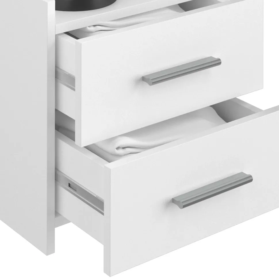 - Die Nachtkommode in Weiß bietet ein offenes Regal und Schubladen mit Soft-Close-Funktion. Trotz ihrer kompakten Größe bietet sie ausreichend Stauraum.