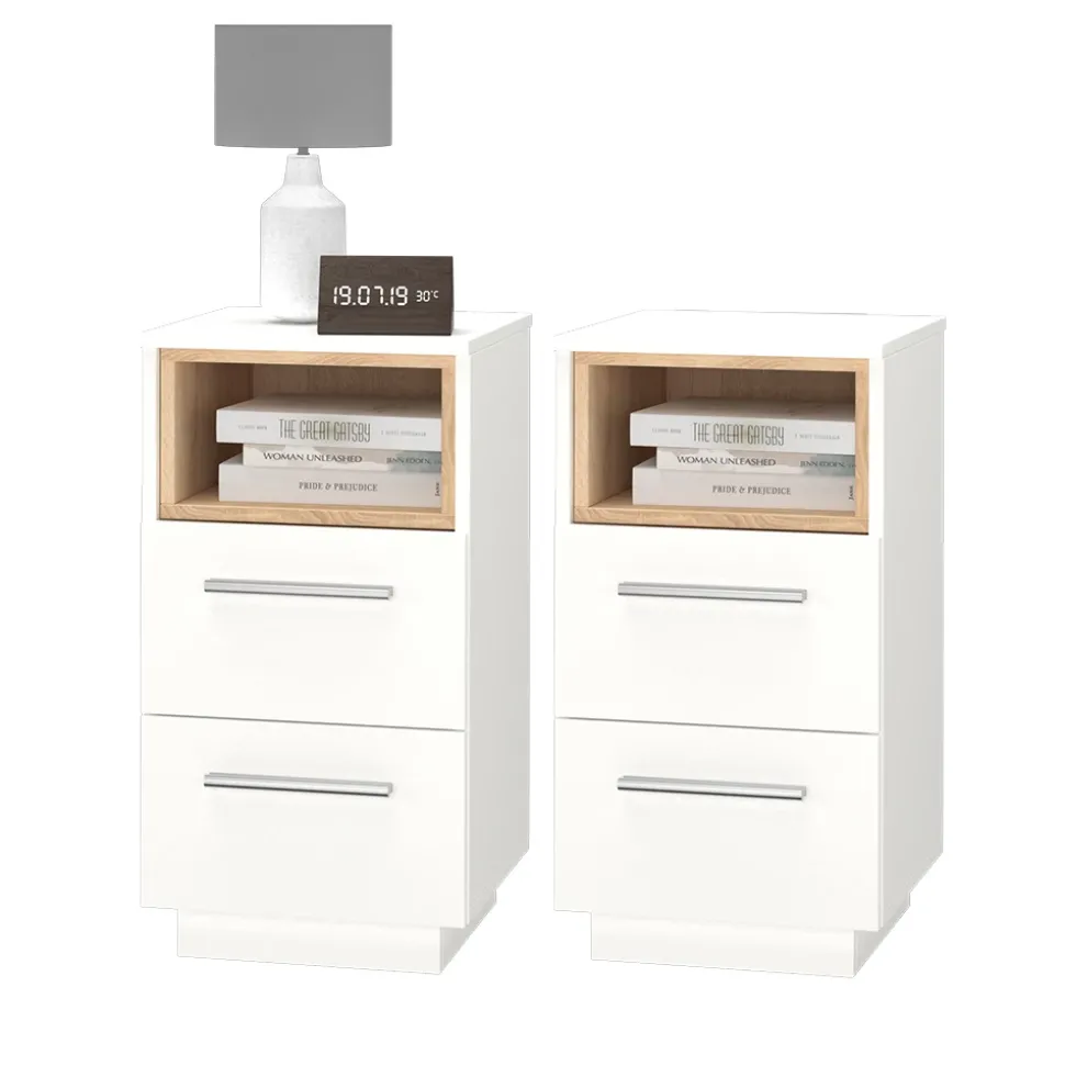 - Die Nachtkommode bietet ein offenes Fach mit Holzdekoreinlage und Soft-Close-Schubladen. Die Farbkombination verleiht ihr eine moderne Optik