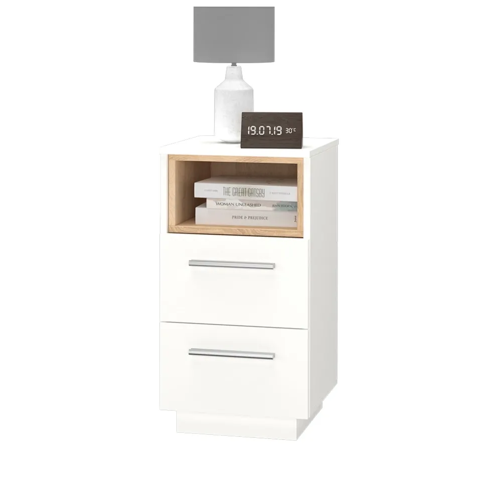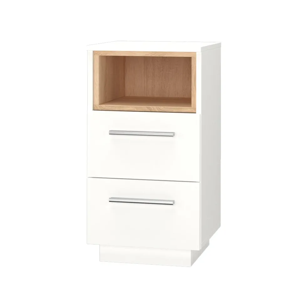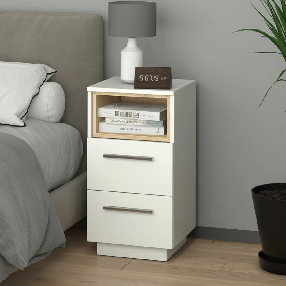 - Die Nachtkommode bietet ein offenes Fach mit Holzdekoreinlage und Soft-Close-Schubladen.