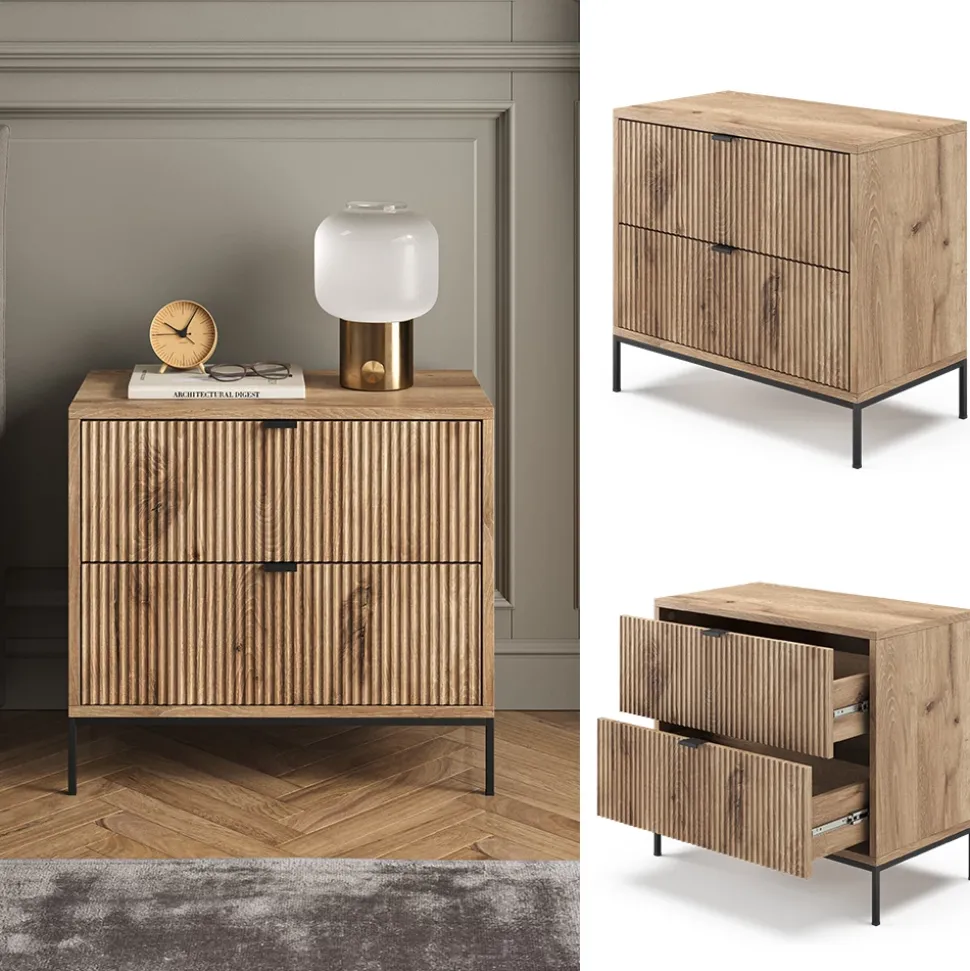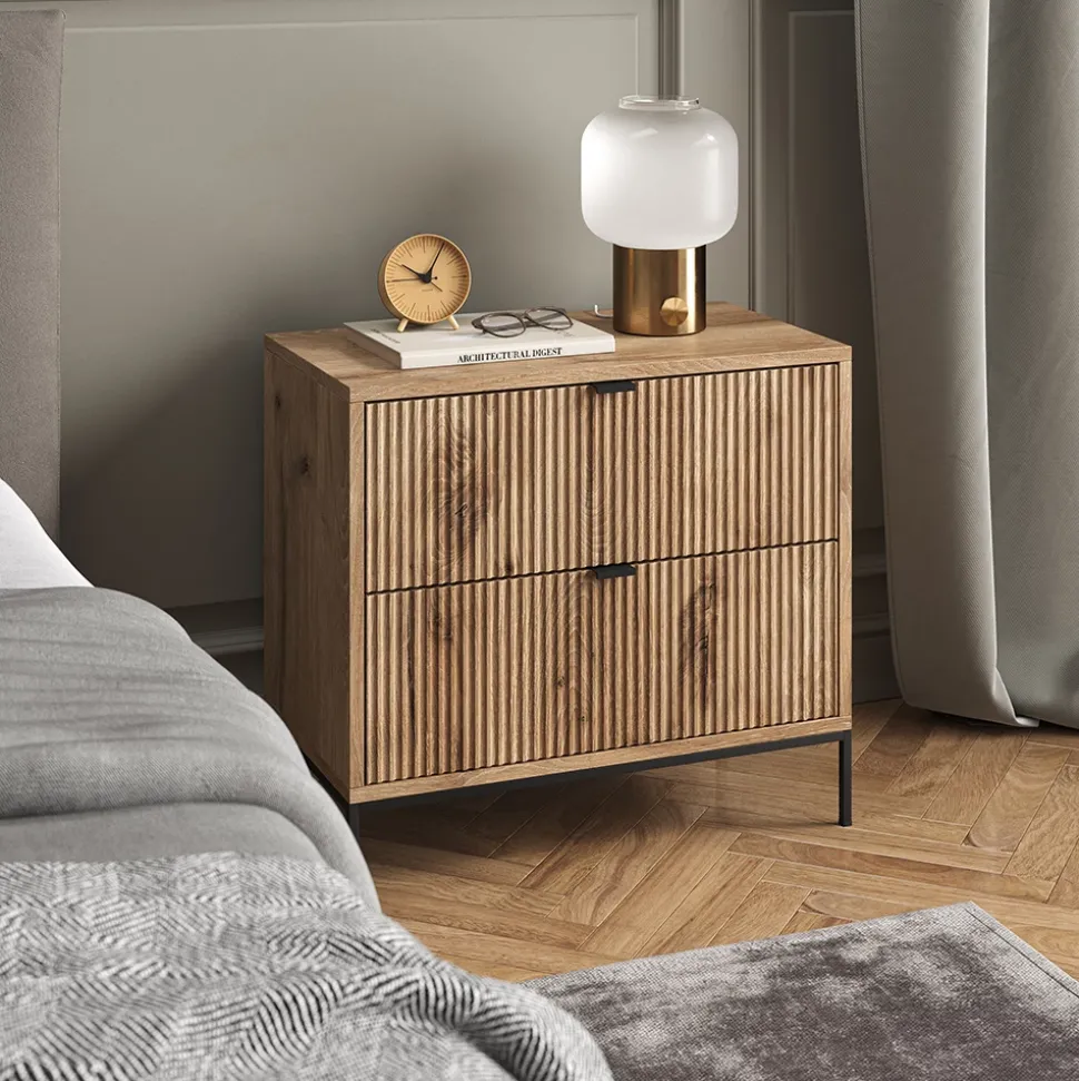 Die Nachtkommode überzeugt mit einem zeitgemäßen Design, das Ihrem Raum eine stilvolle Note verleiht. Mit zwei geräumigen Schubladen bietet die Kommode ausreichend Platz zur Aufbewahrung Ihrer persönlichen Gegenstände. Die Montage ist mühelos und unkompliziert, sodass Sie schnell Freude an Ihrem neuen Möbelstück haben. Das Material ist leicht zu reinigen und besitzt eine hohe Strapazierfähigkeit, wodurch sie langlebig und pflegeleicht ist. Unser Nachtschrank ist Bestandteil der Eliza-Möbelserie.