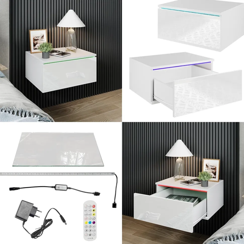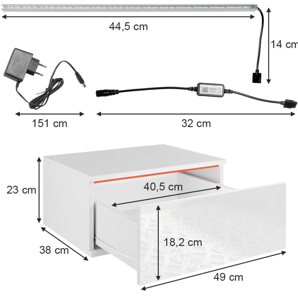 Unser Nachttisch mit LED-Beleuchtung und Fernbedienung kombiniert praktischen Stauraum bei anpassbarer Atmosphäre. Erleben Sie eine vielfältige Farbpalette von 60.000 Farben mit unserem Nachttisch – bunte LED-Streifen – eine individuelle Auswahl. Diese APP kann Musik, Farbe, Helligkeit und Farbtemperatur der LED-Streifen steuern. Die Bedienung ist leicht zu erlernen und zu bedienen. Dank der detaillierten Anleitung lässt sich der Nachttisch spielend leicht aufbauen. Machen Sie Ihr Zuhause noch komfortabler und stilvoller.
