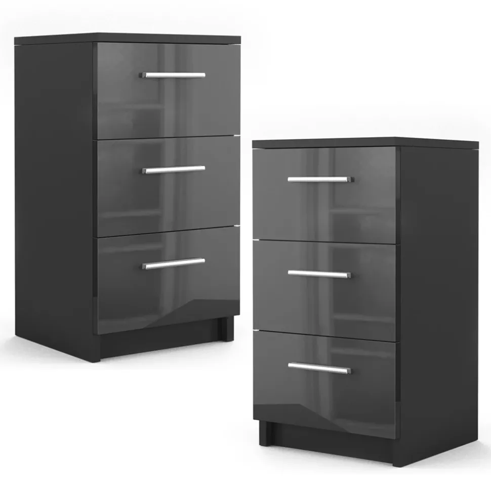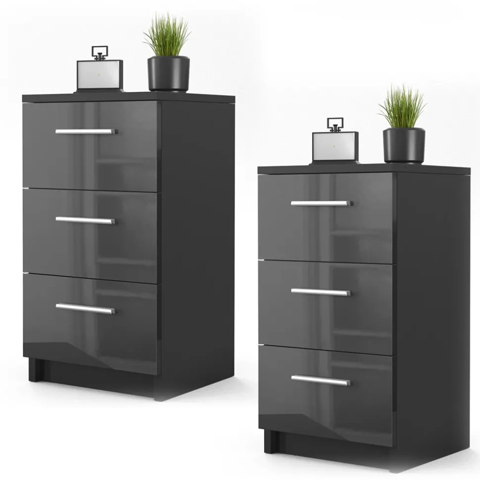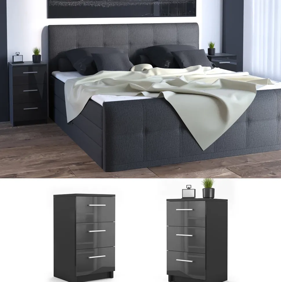 Das 2er Set Nachttische ist die perfekte Ergänzung für jedes Boxspringbett. Mit seinem modernen und stilvollen Design fügt es sich nahtlos in jedes Schlafzimmer ein. Aber es ist nicht nur schön anzusehen, sondern auch äußerst funktional. Mit seinen drei geräumigen Schubladen bietet es Ihnen ausreichend Platz, um alle wichtigen Dinge griffbereit zu haben. Ob Sie nun ein Buch, Ihre Brille oder Ihre Lieblings-Bettlektüre aufbewahren möchten – Der Nachtschrank ist eine ideale Wahl. Aber das Beste daran? Es ist Teil einer Serie mit anderen Optionen, die Sie miteinander kombinieren können. So können Sie ein ganzheitliches Schlafzimmer-Set schaffen, das perfekt auf Ihre Bedürfnisse zugeschnitten ist. Und wenn Sie sich schon immer einen Beistelltisch gewünscht haben, der stilvoll und funktional ist, dann ist der Nachttischschrank die perfekte Wahl für Sie. Nutzen Sie ihn zum Beispiel als Ablage für Ihren Laptop oder als Platz für Ihre Tasse Tee am Morgen. Mit diesem Set Nachttische haben Sie alles in Reichweite. Erwerben Sie dieses 2er Set Nachttische noch heute und gönnen Sie sich die qualitativ hochwertige und stilvolle Ergänzung für Ihr Boxspringbett.