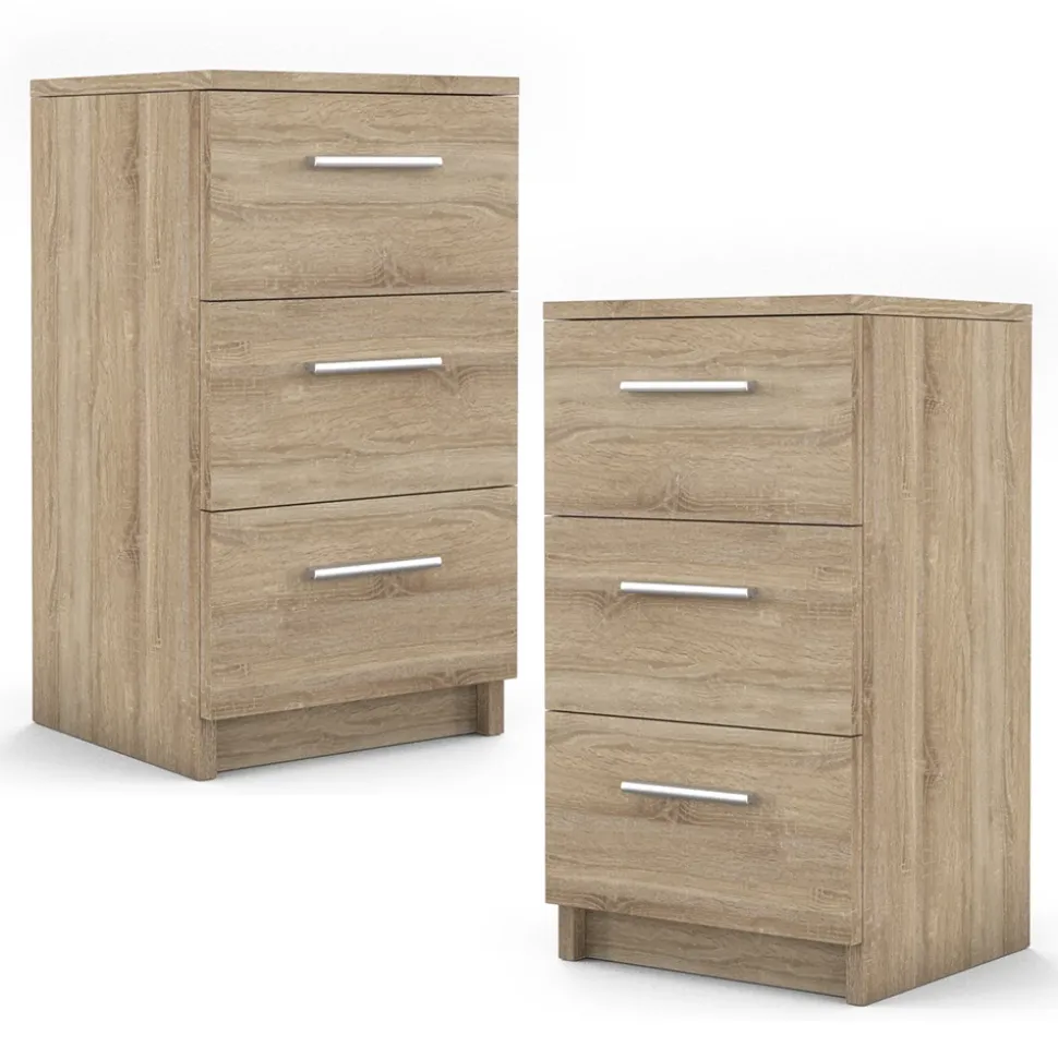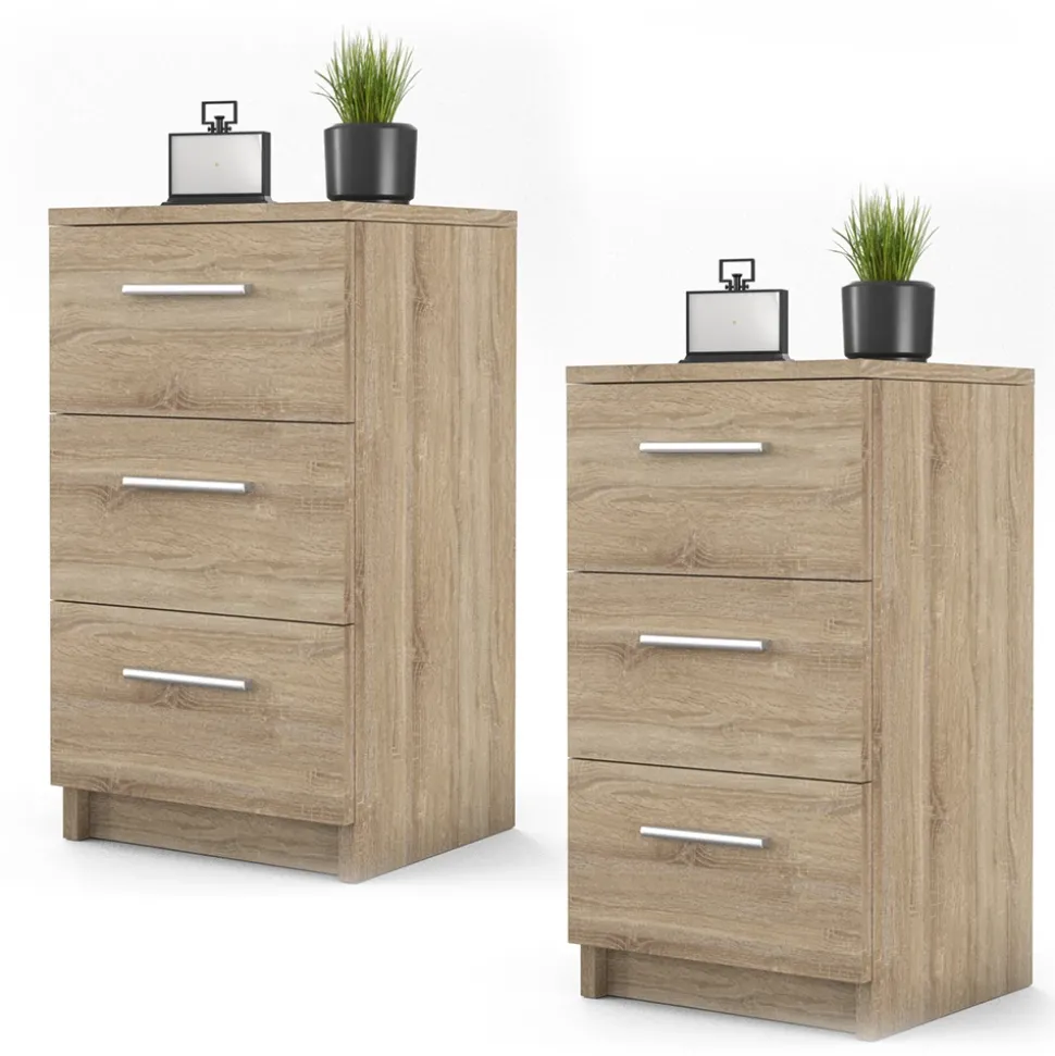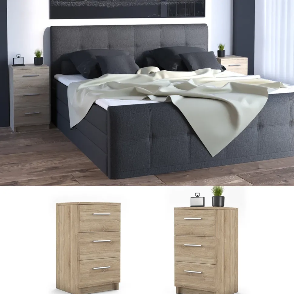 Das 2er Set Nachttische ist die perfekte Ergänzung für jedes Boxspringbett. Mit seinem modernen und stilvollen Design fügt es sich nahtlos in jedes Schlafzimmer ein. Aber es ist nicht nur schön anzusehen, sondern auch äußerst funktional. Mit seinen drei geräumigen Schubladen bietet es Ihnen ausreichend Platz, um alle wichtigen Dinge griffbereit zu haben. Ob Sie nun ein Buch, Ihre Brille oder Ihre Lieblings-Bettlektüre aufbewahren möchten – Der Nachtschrank ist eine ideale Wahl. Aber das Beste daran? Es ist Teil einer Serie mit anderen Optionen, die Sie miteinander kombinieren können. So können Sie ein ganzheitliches Schlafzimmer-Set schaffen, das perfekt auf Ihre Bedürfnisse zugeschnitten ist. Und wenn Sie sich schon immer einen Beistelltisch gewünscht haben, der stilvoll und funktional ist, dann ist der Nachttischschrank die perfekte Wahl für Sie. Nutzen Sie ihn zum Beispiel als Ablage für Ihren Laptop oder als Platz für Ihre Tasse Tee am Morgen. Mit diesem Set Nachttische haben Sie alles in Reichweite. Erwerben Sie dieses 2er Set Nachttische noch heute und gönnen Sie sich die qualitativ hochwertige und stilvolle Ergänzung für Ihr Boxspringbett.